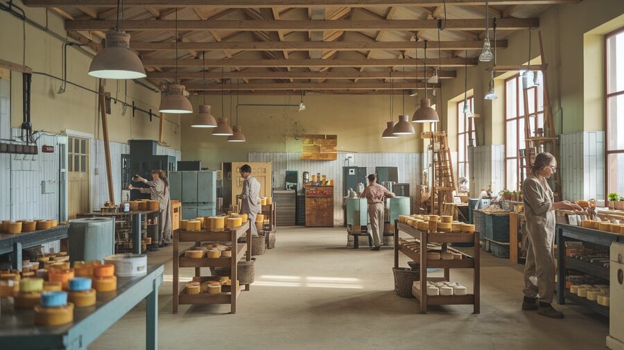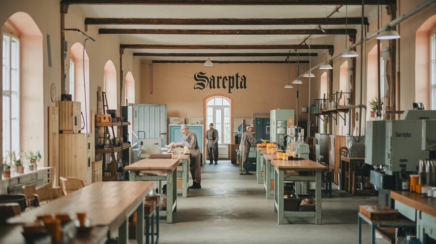 /imagine prompt: A photo of the 'Sarepta' factory with its old-fashioned crafty style. The factory has a countryside and fairly minimalist design, with natural wood textures and muted, earthy colors. The shop is clean and bright, with the right equipment for food production. There are workers in the shop, dressed in special working clothes. The company produces mustard tea, carrot tea, steppe tea, mustard oil, watermelon coffee, and watermelon honey. In the distance, the 'Sarepta' logo is visible in the gothic font