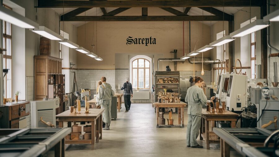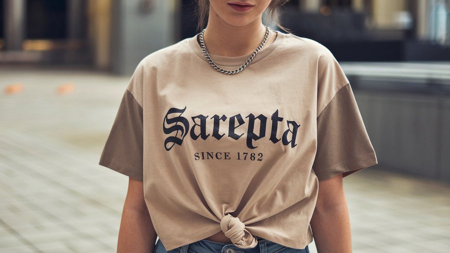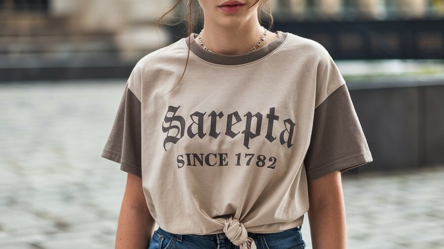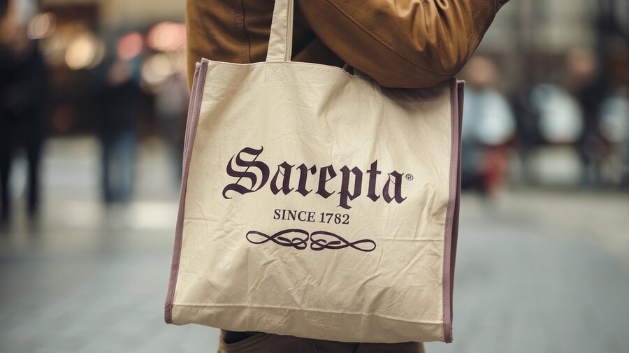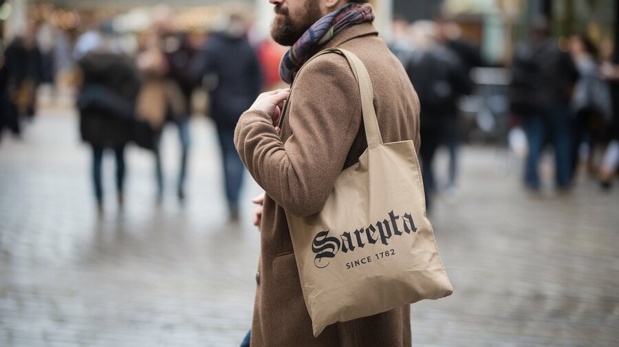 1. A photo of a man standing on the street with a shopper bag hanging on his shoulder. The bag is branded 'Sarepta' and has a gothic font. The bag has an old-fashioned crafty style and shallowly says 'since 1782'. The background is blurred 2. A photo of a woman wearing an apron with the text 'Sarepta' and a gothic font. The apron has an old-fashioned crafty style and says «since 1782». The background is blurred and contains shelves with various products. The woman is standing in the store of the company that produces the products 3. A photo of a young woman standing in an urban setting with a beige t-shirt that has the brand name 'Sarepta' and the tagline 'SINCE 1782' printed in black. The t-shirt has a knot tied at the front. She also wears a silver chain necklace. The background reveals a paved pathway, possibly a plaza, with some architectural structures visible