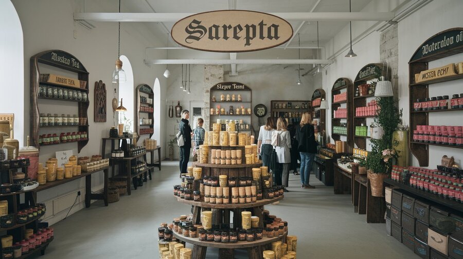 1. A photo of a vintage-style shop named 'Sarepta'. There are various non-dairy flavor products on display, including mustard tea, steppe tea, carrot tea, mustard oil, watermelon coffee, and watermelon honey. The shop has a gothic font and an old-fashioned crafty style. There are visitors in the shop, and the merchandise is laid out in an orderly fashion. The place is bright and minimalistic 2. A photo of a modern space called 'Sarepta', named in honor of the German settlement near Volgograd. The packaging has a vintage design with a gothic font and an old-fashioned crafty style. The brand is engaged in the production of non-dairy flavor products: mustard tea, steppe tea, carrot tea, mustard oil, watermelon coffee, watermelon honey. The image has a cash register with a vendor, as well as displays of merchandise