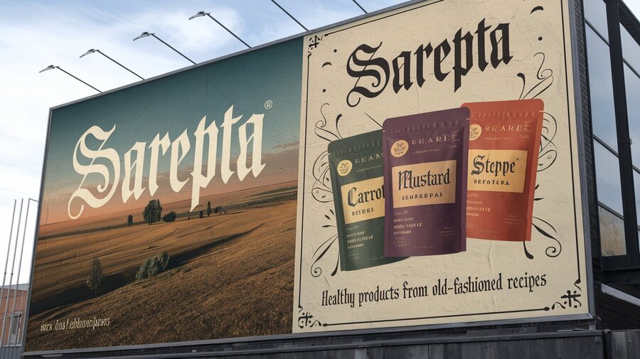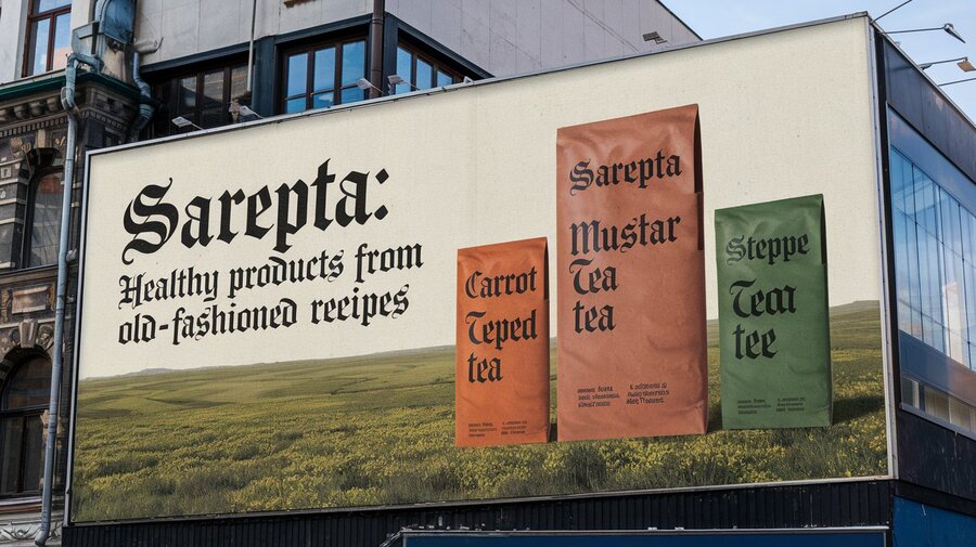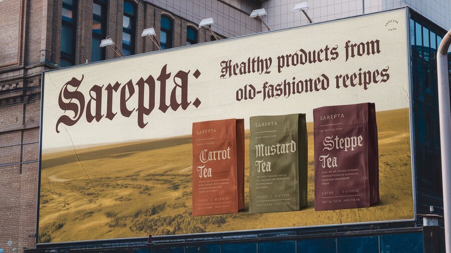 1. /imagine prompt: A photo of a vintage and minimalistic billboard on the side of a building with a modern advertisement for Sarepta. The billboard has a white background and earthy-colored text written in gothic fonts. The text says 'Sarepta: healthy products from old-fashioned recipes'. There are rectangular packages of three types of tea — carrot tea, mustard tea, and steppe tea. The background contains a depiction of the steppe