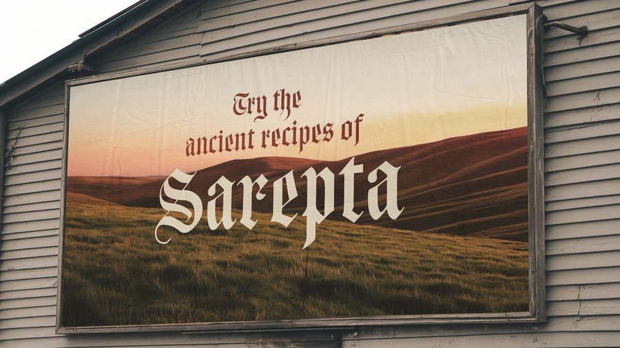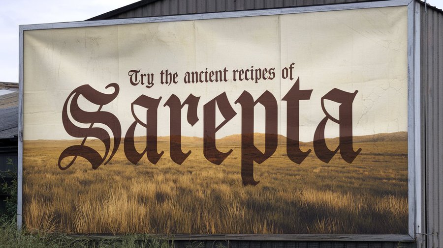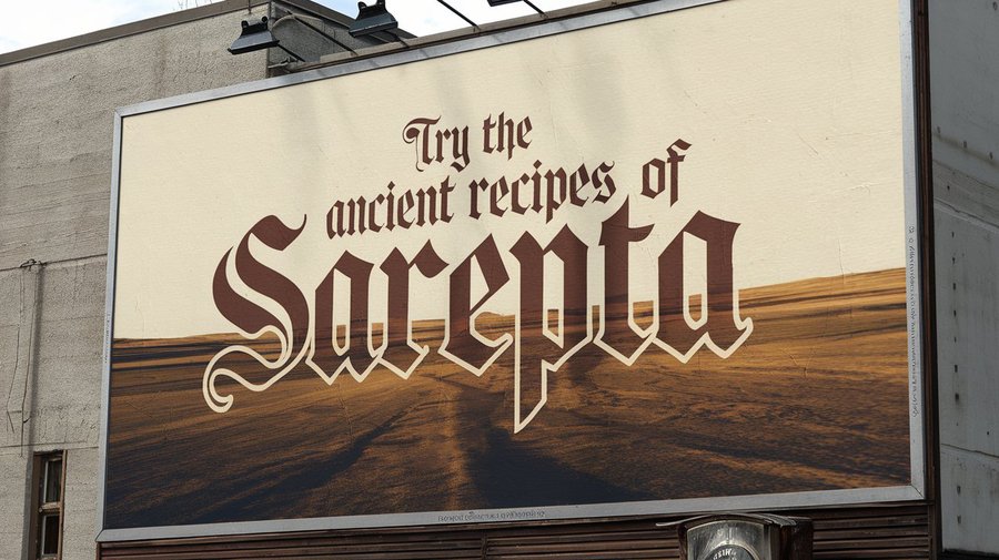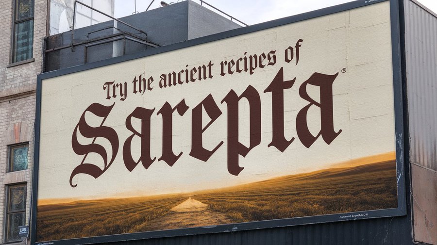 2. /imagine prompt: A photo of a vintage and minimalistic billboard on the side of a building with a modern advertisement for Sarepta. The billboard has a white background and earthy-colored text written in gothic fonts. The text says 'Try the ancient recipes of Sarepta'. The background of the billboard contains a depiction of the steppe and the text should fit in with the steppe landscape background. The scenery overlaps the text a little bit. The billboard is a little more remote
