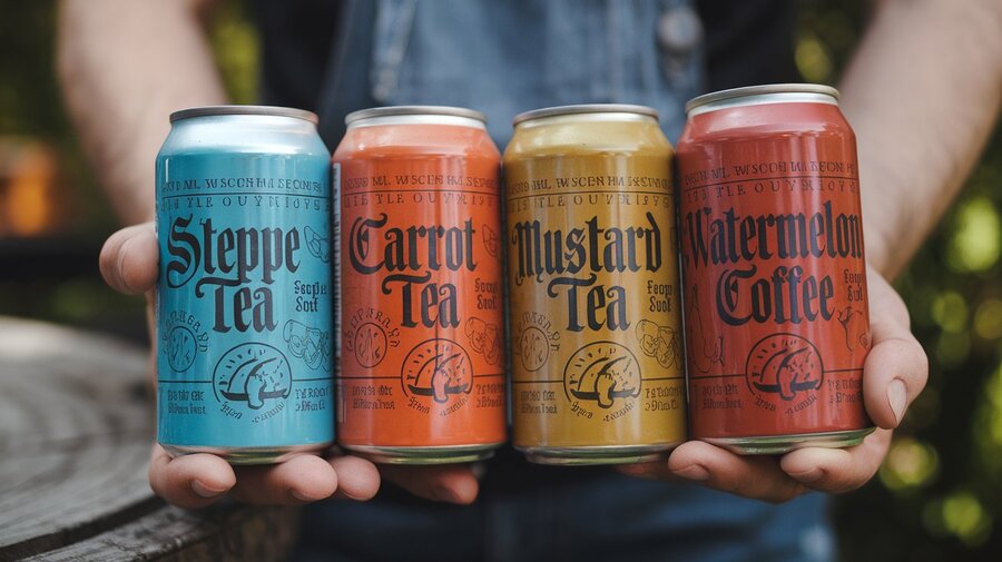 /imagine prompt: A photo of a person’s hands holding four vintage-style 350 ml aluminum cans. The cans contain cold drinks: steppe tea, carrot tea, mustard tea, and watermelon coffee. The cans have a gothic font and an old-fashioned crafty style. The background is blurred and contains a wooden table and greenery