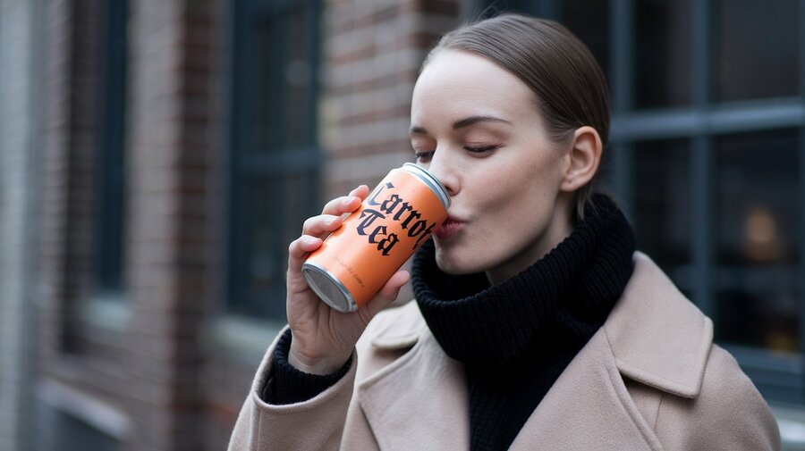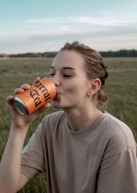 /imagine prompt: A photo of a young woman seated outdoors in a vast grassy field. She is wearing a simple beige t-shirt and is in the process of drinking from an orange can with gothic font text 'Carrot Tea' on it. The sky above is clear with a hint of clouds, suggesting a pleasant day. The horizon reveals a distant line of trees, and the overall ambiance of the picture is serene and relaxed