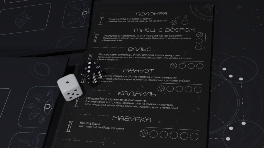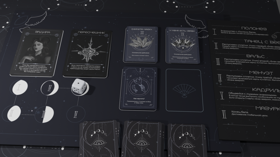 В настольной игре 4 участника выполняют серию из 6 танцев на бале-маскараде в течение 60 минут. Игроки используют стратегию, тактические ходы и взаимодействуют с другими участниками, чтобы получить преимущество и выиграть. В процессе игры возможны неожиданные события, которые могут повлиять на ход состязания. Задача — обыграть соперников и достичь победы.