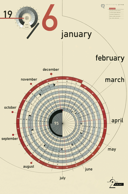 У меня есть два любимых жанра в дизайне: товарные знаки и календари. Товарные знаки привлекают минимализмом, символизмом и высокой концентрацией образа в лаконичной форме, а календари — детальностью и протяженностью восприятия во времени. Каждый раз, работая над календарем, нужно показать время, одну из сложнейших и самых абстрактных философских категорий. Календарь — всегда размышление на эту тему. В календаре для компании 2print я работал над идеей спирального хода времени, и было достаточно сложно обойтись без привычной календарной сетки из 12 одинаковых блоков. К тому же, тогдашние маломощные компьютеры едва справлялись с таким количеством векторной графики. Но в итоге получилась красивое и нестандартное решение вечной темы, даже почти удобное в использовании.