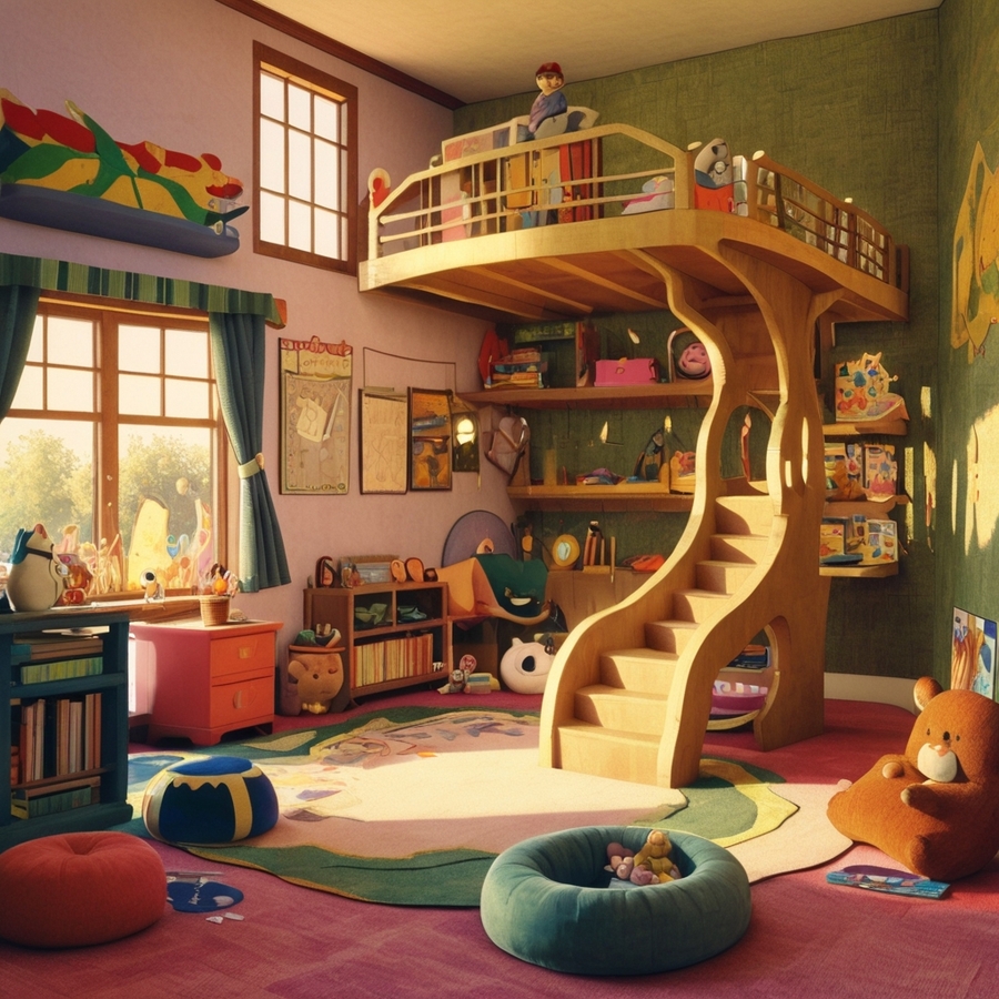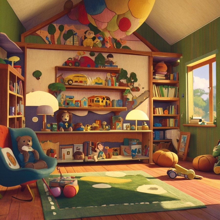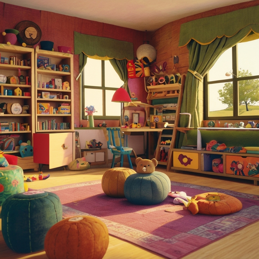 Prompt (leonardo.ai, слева референс из оригинального проекта): A whimsical, bustling kindergarten playroom comes to life in vivid detail: filled with an array of colorful toys and a towering house structure tucked into one corner, all set against a soft, plush carpet. This enchanting scene is brilliantly captured in a lively, visually engaging painting. Vibrant hues and intricate details bring each toy and corner of the room to life, creating a captivating image that evokes the joy and wonder of childhood. The high level of artistry and attention to detail in this image truly make it a masterpiece worth admiring. There are no bookshelves and books here. There are paintings with trees and flowers on the walls