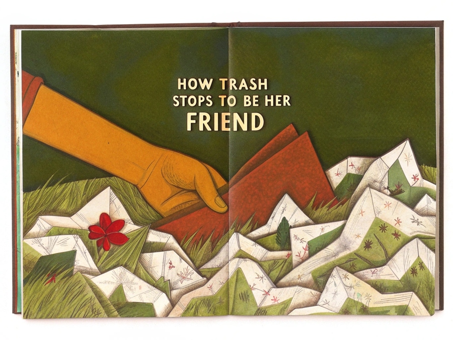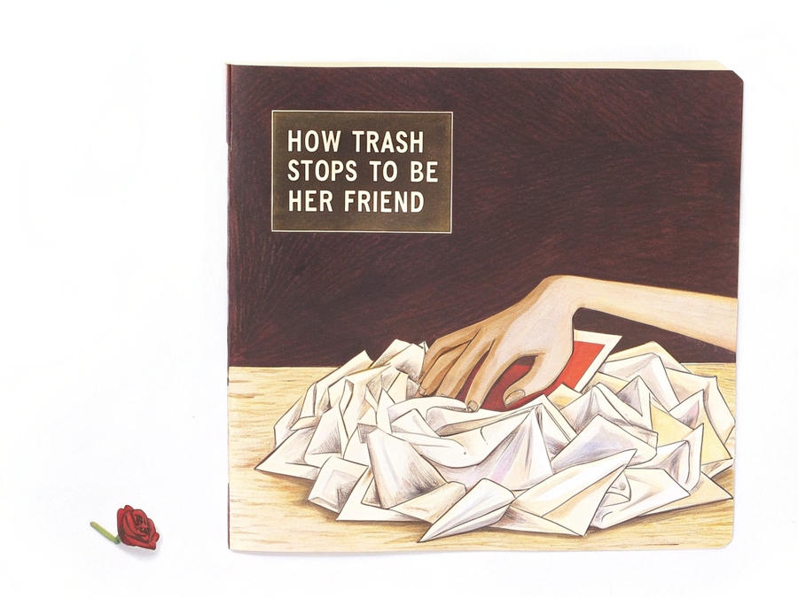 Prompt (1,2 картинки, recraft.ai): A photo of book cover in a4 gorizontal formal, displaying a vintage poster-style illustration. A hand, depicted in a muted reddish-brown tone, is shown pressing down on a pile of crumpled papers. The papers are various shades of off-white and beige; some are intricately crumpled, suggesting a chaotic pile. A small red flower or object is visible amidst the crumpled papers. The girl lying behind papers, her hand is positioned above the papers, implying a forceful action. The background is a dark brownish-gray tone, suggestive of a room or table. Text in a bold sans-serif font is prominently displayed on the cover. The text reads «How trash stops to be her friend» which suggests a title relating to the theme of discussion, argumentation, or transforming garbage into something else.