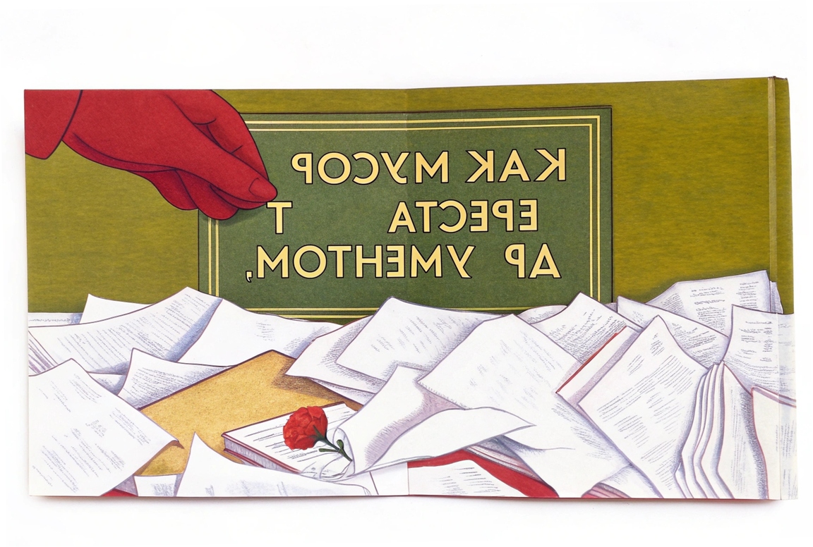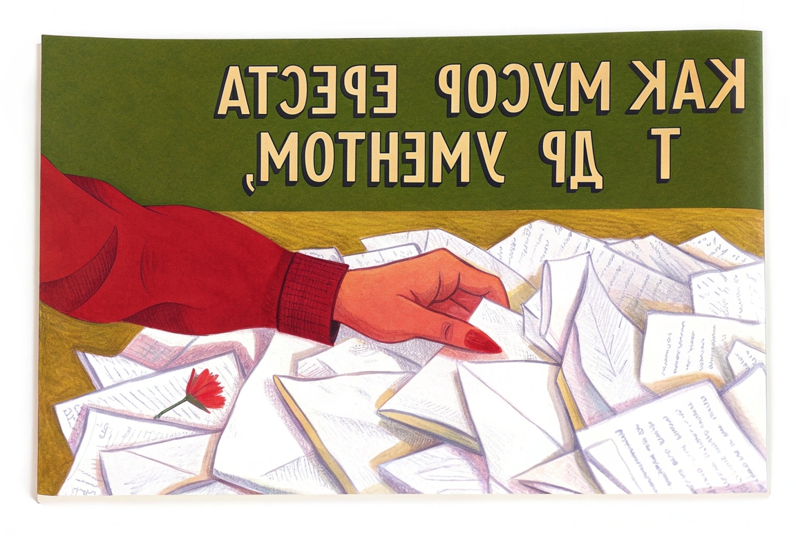 Prompt (3, 4 картинка, recraft.ai): A photo of book cover, displaying a vintage poster-style illustration. A hand, depicted in a muted reddish-brown tone, is shown pressing down on a pile of crumpled papers. The papers are various shades of off-white and beige; some are intricately crumpled, suggesting a chaotic pile. A small red flower or object is visible amidst the crumpled papers. The hand is positioned above the papers, implying a forceful action. The background is a dark brownish-gray tone, suggestive of a room or table. Text in a bold sans-serif font, in Cyrillic, is prominently displayed on the cover. The text reads «Как мусор перестал быть аргумом,» which suggests a title relating to the theme of discussion, argumentation, or transforming garbage into something else.