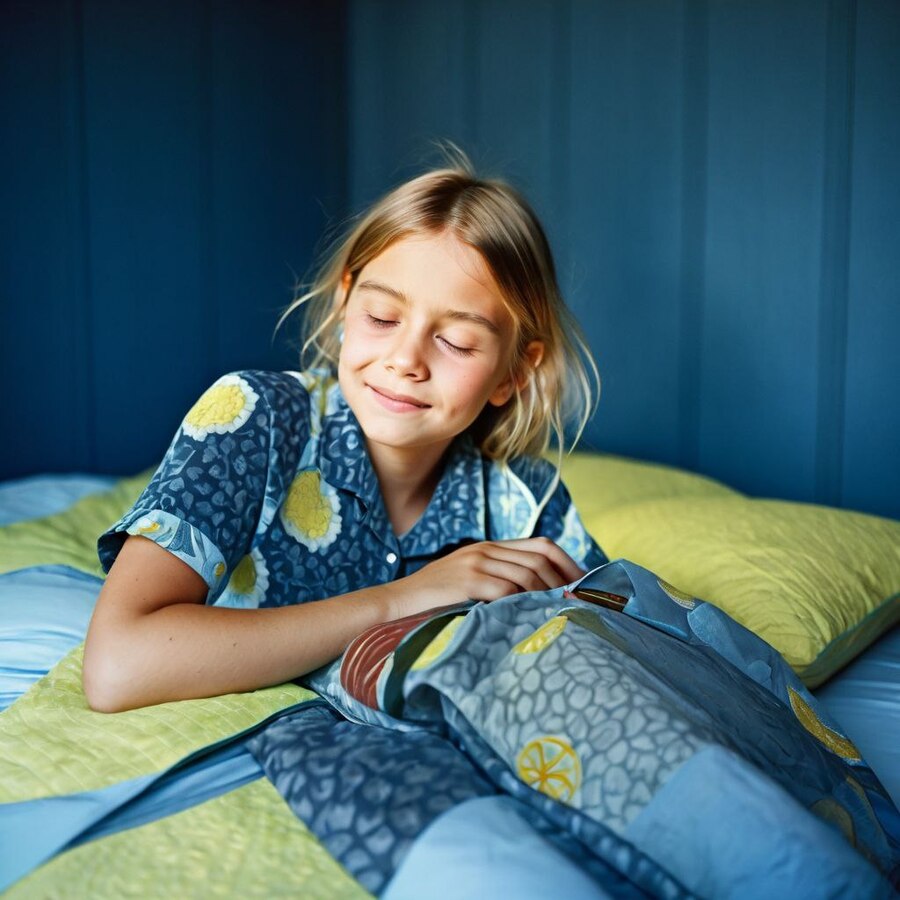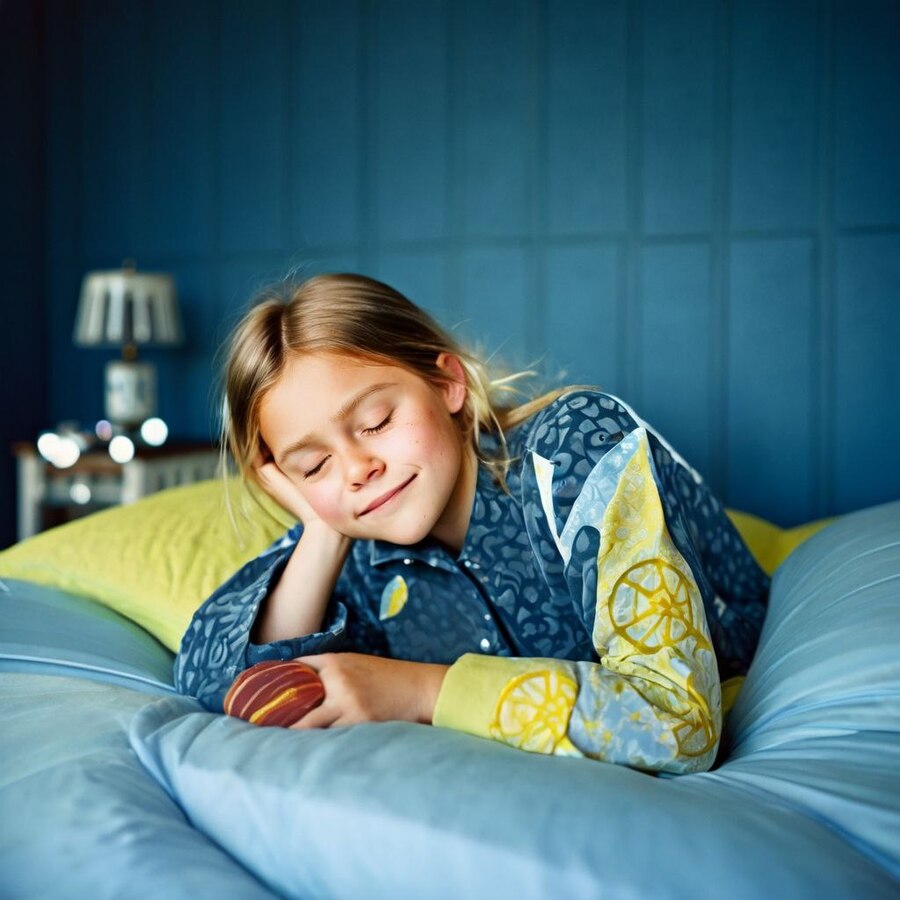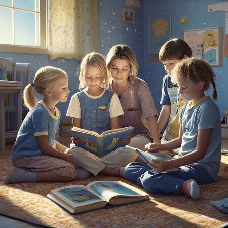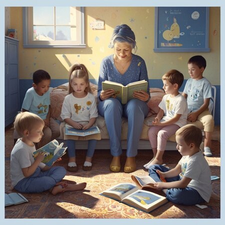 Prompt (leonardo.ai, слева референс): photos of 5 children getting ready for bed in kindergarten. The teacher, old woman, is sitting next to her and reading a book, she is wearing a white oversize T-shirt. use the background from the reference. The color palette must be: 3b82bf, 418fbf, 7eb6d9, eff299, f2f2f2