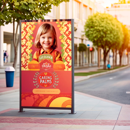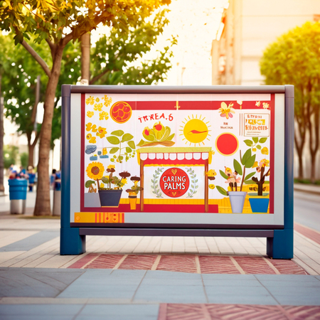 Сначала была сгенерирован отдельно мокап и картинка в recraft.ai. Prompt (мокап): The advertisment banner on the green street Prompt (картинка): Create a bright and friendly MINIMALISTIC logo IN A WHITE BACKGROUND for a private kindergarten that symbolizes support and care for every child. The logo should include stylized images of children playing and smiling, surrounded by elements of nature such as trees and flowers. Use soft and attractive colors to create a sense of comfort and security. Add elements to the design that symbolize unity and friendship, for example, hands joining in a circle, or hearts. In the center of the logo, place the name of the kindergarten «CARING PALMS» in a friendly and easy-to-read font.