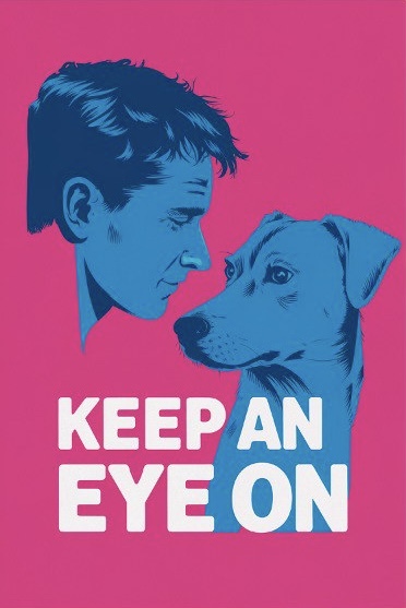 Promt examples: a minimalist «Keep an eye on» shelter logo featuring a man with a short haircut in profile looking into the eyes of a dog, also in profile, i.e. a side view. The logo should be blue, the name «keep an eye on» should be located below the image of the man and dog.
