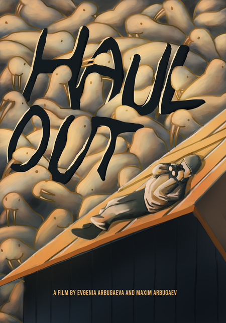 a poster depicting a book containing a researcher’s story of observing the hauling-out event of walruses on the beach.