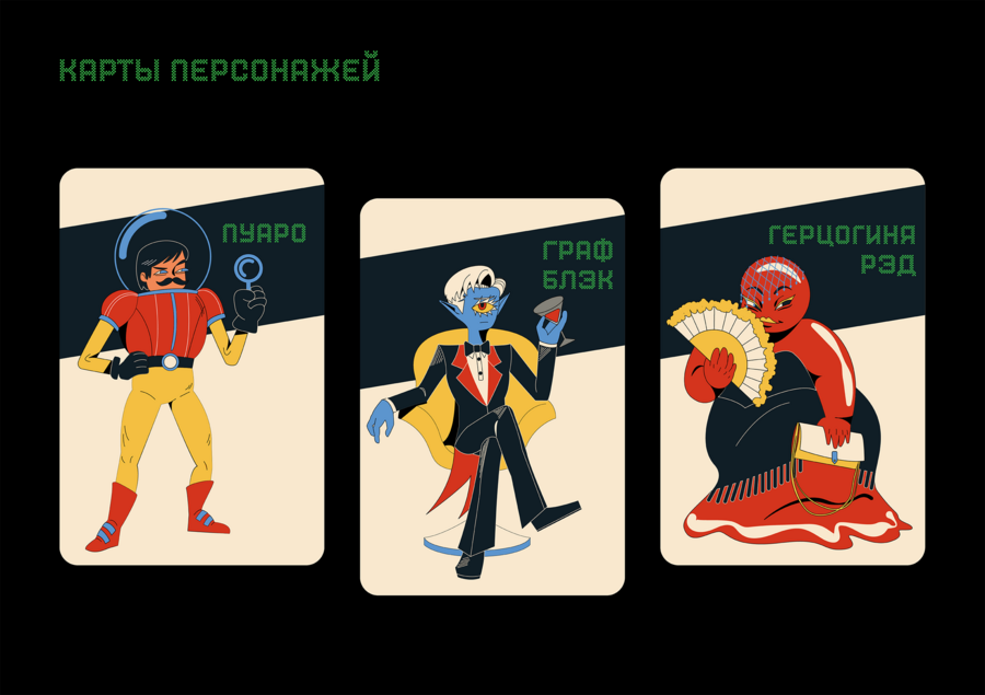 Концепт арт персонажей для настольной игры «Марсианский экспресс». Один из них должен быть похож на Эркюля Пуаро. Персонажи должны быть инопланетянами, отличаться друг от друга. Стиль Detective Comics.