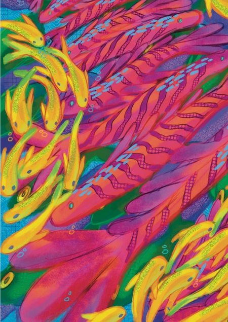 Графическая серия «Рыбный круговорот» посвящена подводному миру и его обитателям, а именно рыбам, они постоянно в движении, плавают в разные стороны, пересекают друг друг и закручиваются в спирали, создавая невообразимые круговороты, дополняя друг друга.