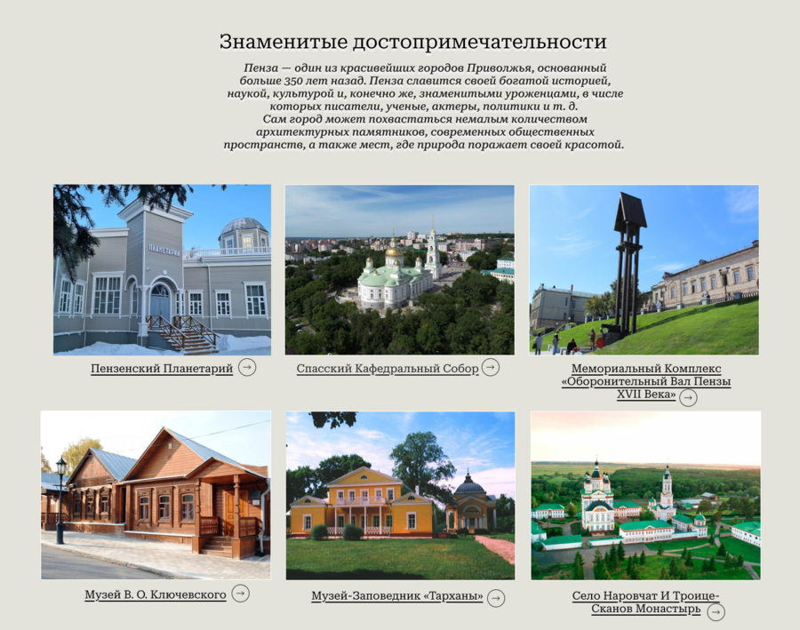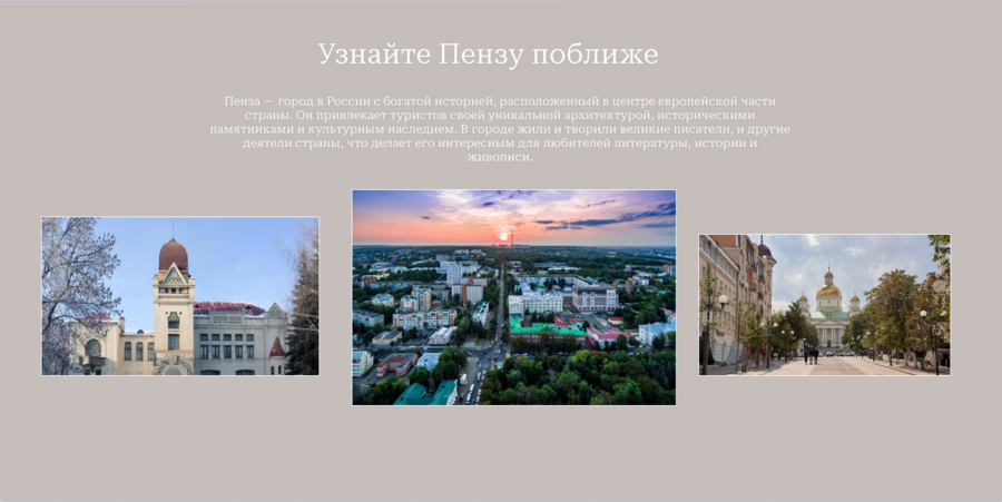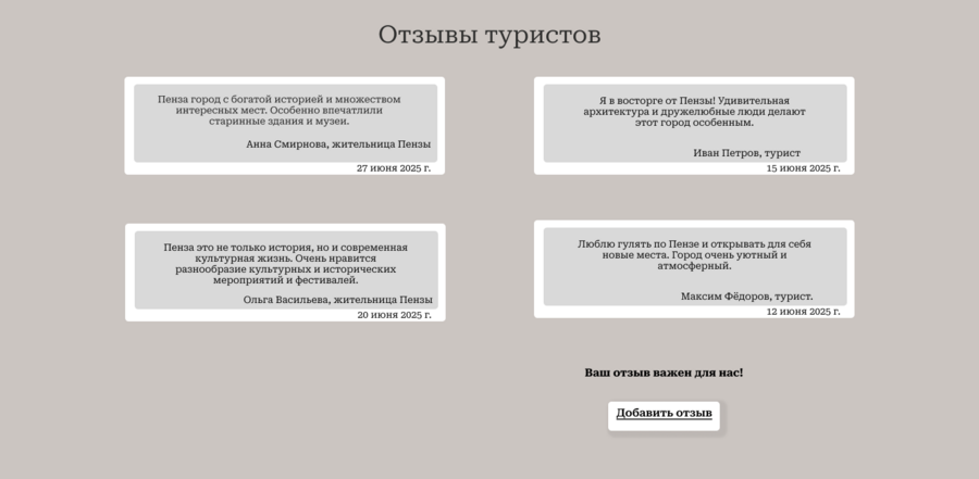 Идея: Создание современного веб-ресурса, ориентированного на продвижение внутреннего туризма в Пензе — городе с богатой историей, культурой и потенциалом для развития. Сайт станет единым информационным пространством для путешественников, жителей региона и бизнеса. Почему этот сайт имеет актуальность? 1. Растущий интерес к внутреннему туризму Текущая социально-экономическая обстановка усилила внимание к путешествиям по России. Люди ищут новые направления внутри страны, особенно — в малых и средних городах. 2. Недооценённый туристический потенциал Пензы Пенза обладает уникальным сочетанием: историко-культурного наследия, природных маршрутов, событийного и гастрономического туризма. Однако до сих пор не имеет удобного, современного туристического гида. 3. Поддержка локального бизнеса и имиджа региона Сайт поможет: продвигать локальные бренды, гостиницы, кафе, ремесленные мастерские; создать современный образ города как привлекательного, живого и доступного туристического направления. На самом сайте: Цифровые маршруты по городу и области (исторические, тематические, прогулочные); Каталог мест: от отелей до локальных магазинов; Галерея Раздел статьи: «Город глазами местных» (— интервью, фото.) Контакты. Цели проекта: Увеличение туристического потока в регион -Рост узнаваемости Пензы как культурного и событийного направления -Привлечение внимания к локальным инициативам и бизнесу -Формирование устойчивого digital-продукта для внутреннего туризма