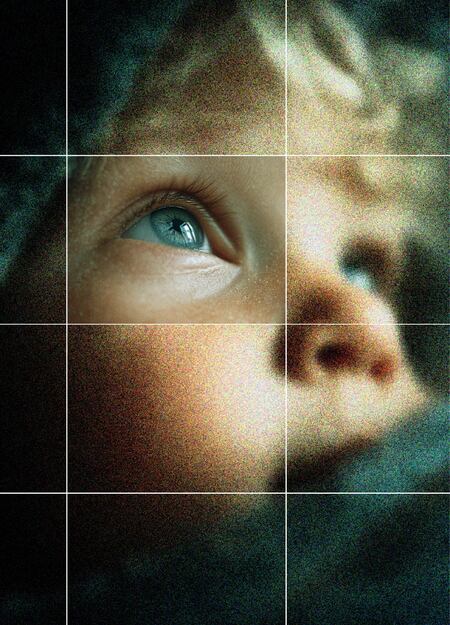 Плакат «0,4 — 0,7» посвящён детскому зрению. Зрение у младенцев — это путь от размытого чёрно-белого мира к яркому и чёткому. Именно это изменение я хотела отобразить в своём плакате. Сетка была включена в композицию плаката, в качестве олицетворения различных этапов развития зрения, параллельных с взрослением.