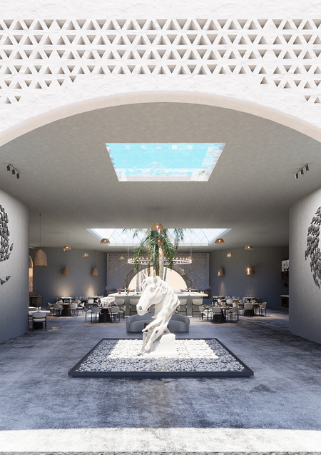 Ресторан расположен в живописном городе Дахаб, Южный Синай, Египет. Расположенный в самом сердце пустыни, он может похвастаться потрясающим видом на горы Красного моря. Дизайн ресторана сочетает в себе современные формы с традиционными элементами, создавая непринужденную атмосферу, которая гармонично сочетается с окружающей природой. Белоснежные арки, просторные залы и обильное освещение подчеркивают уникальный характер ресторана. Вокруг ресторана растут пальмы, а его интерьер украшен современными произведениями искусства и панорамными окнами, из которых открывается потрясающий вид на море и пустынный ландшафт. Это идеальное место для любителей природной красоты, спокойствия и изысканной кухни.