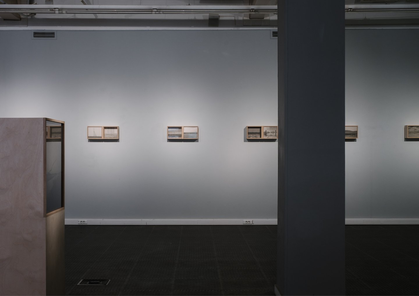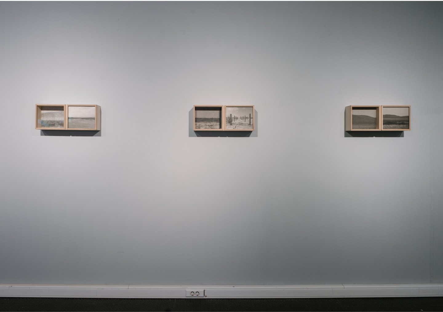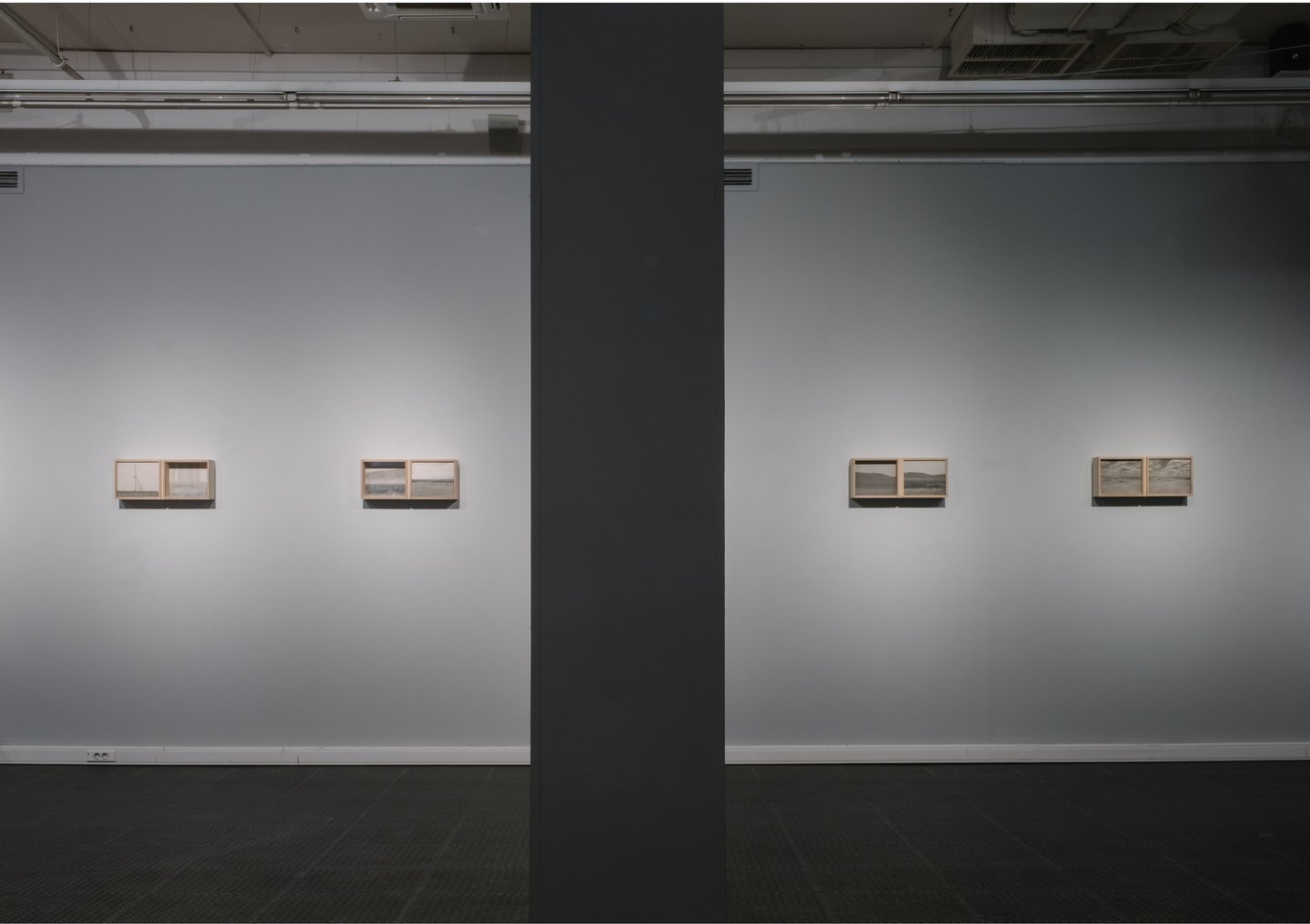 По периметру одной стены развешаны фотографические объекты из серии «До твоей стороны» (2025) — зафиксированные ландшафты помещенные в своеобразные контейнеры. Образно они выстроены так, чтобы можно было в стадиях разглядеть приближение изображений от общих планов до мельчайших зерен снимков, формирующих плоть фотографии. Художник изучает свойства фото — поверхность, фиксирование, зернистость — и сводит реальность до фактуры пленки. Образы где-то доступны зрению, где-то размываются и распадаются в воображении на составные части.