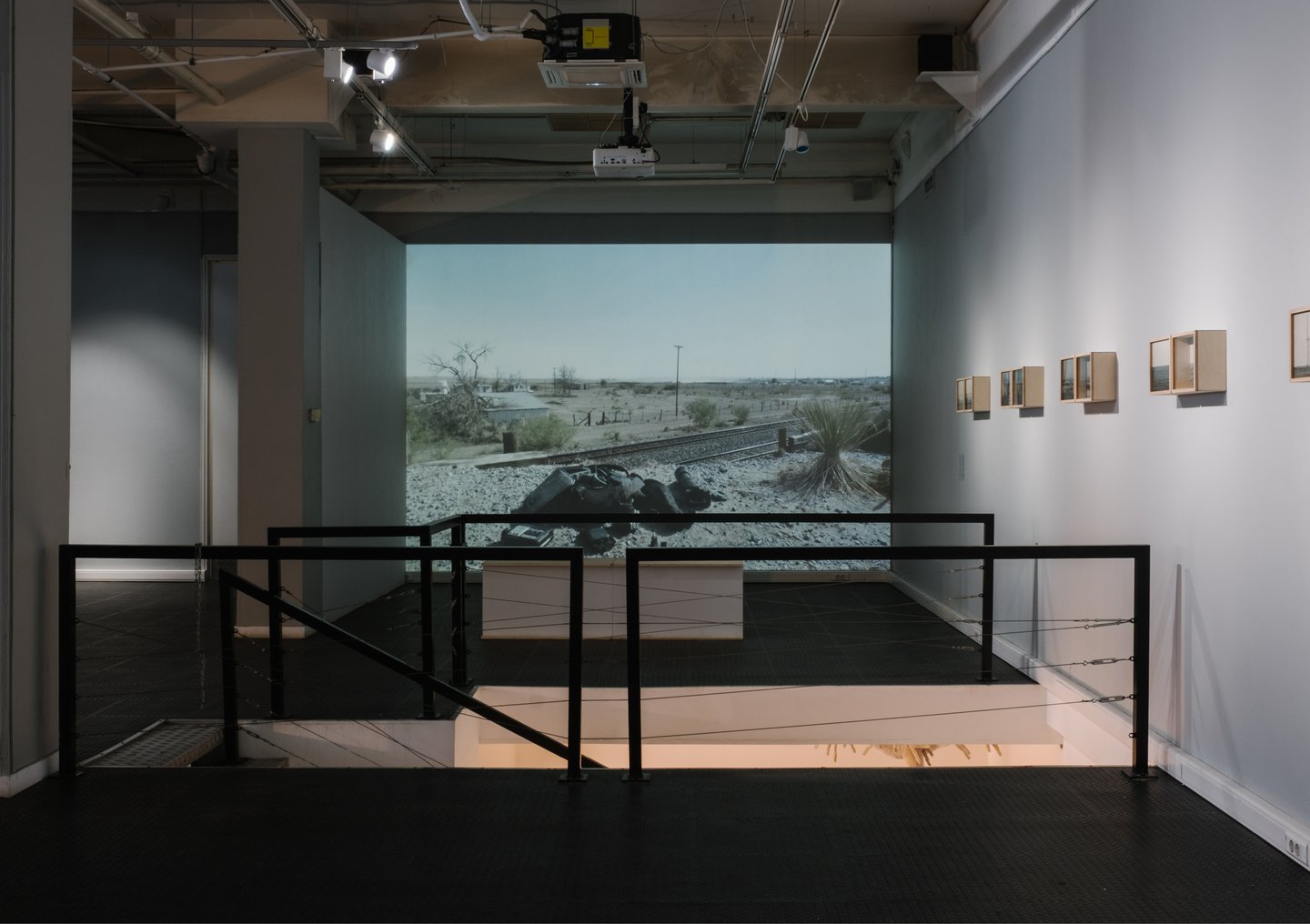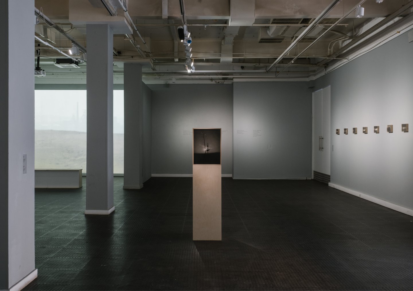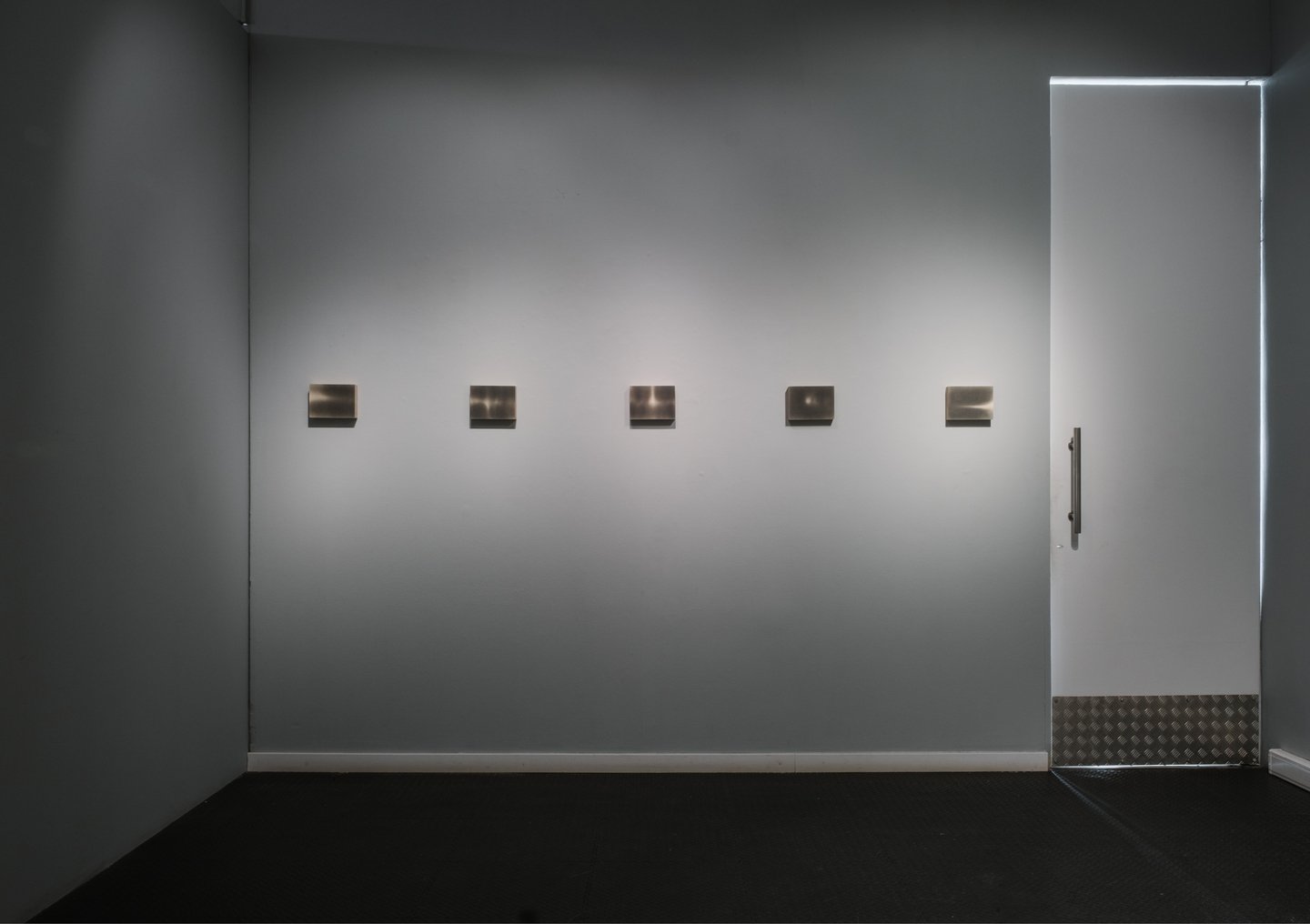 По периметру одной стены развешаны фотографические объекты из серии «До твоей стороны» (2025) — зафиксированные ландшафты помещенные в своеобразные контейнеры. Образно они выстроены так, чтобы можно было в стадиях разглядеть приближение изображений от общих планов до мельчайших зерен снимков, формирующих плоть фотографии. Художник изучает свойства фото — поверхность, фиксирование, зернистость — и сводит реальность до фактуры пленки. Образы где-то доступны зрению, где-то размываются и распадаются в воображении на составные части.