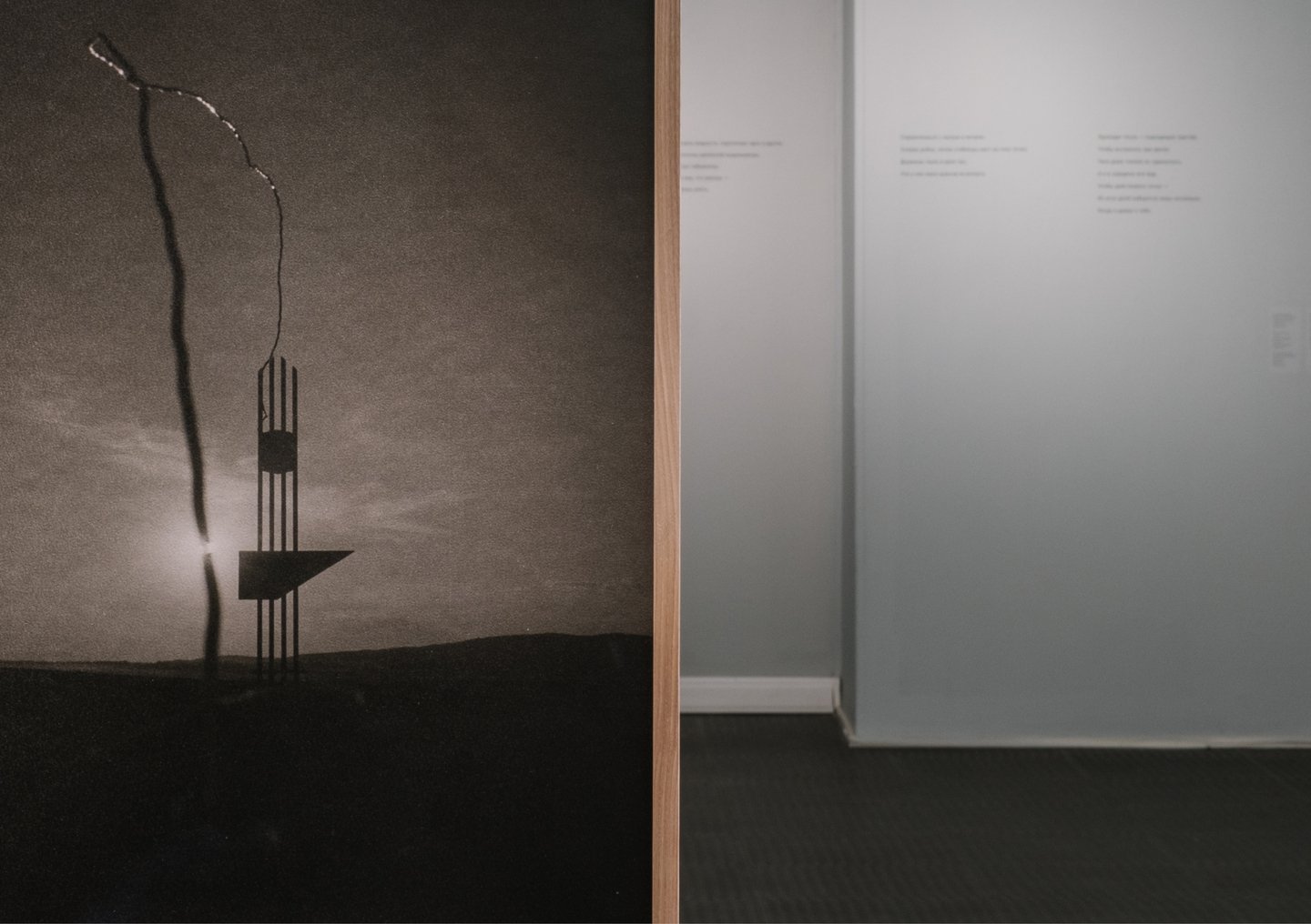 Центральный объект — «Встреча № 1» (2025). Черно-белые отпечатки встроены в деревянную конструкцию — почти что стелу или межевой знак. Он маркирует переход, но не подводит итог. Как и сам проект — это разметка пути, а не финальная точка маршрута.