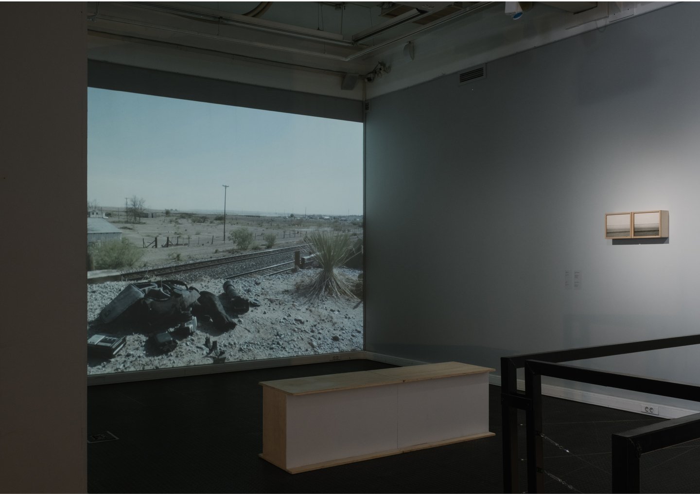 Видео-инсталляция «До твоей стороны» (2025) — один из завораживающих нервов экспозиции. Двухканальный образ здесь как чередование дыхания: трасса, машина, вода, степи, пустые не-места, ветра. Медитативная протяженность работы втягивает в себя, позволяя взгляду остаться на одной точке и тем самым уловить все.