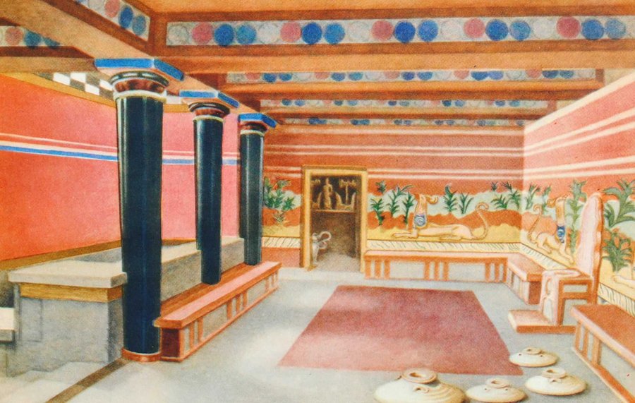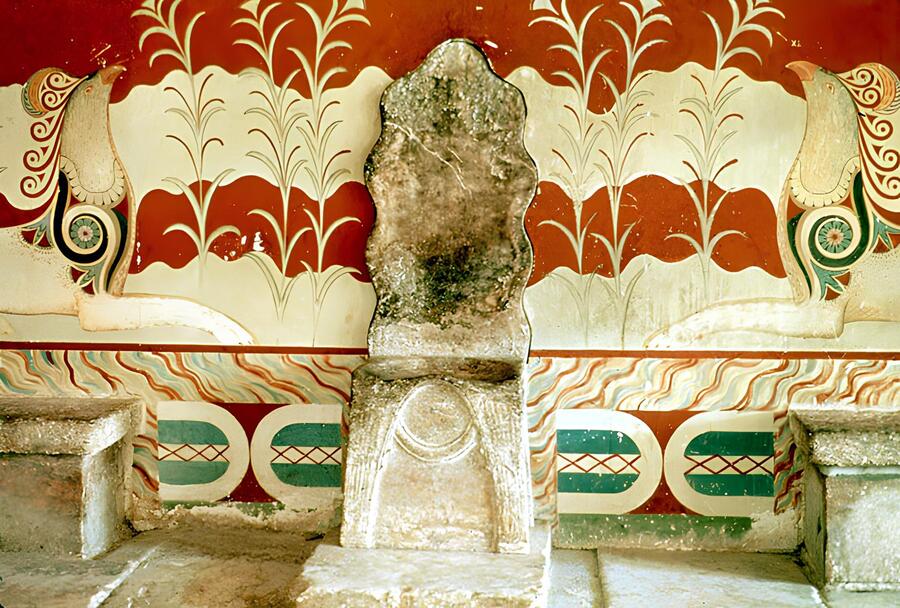 Реконструкция интерьеров и один из оригинальных тронов Кносского Дворца.