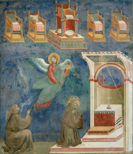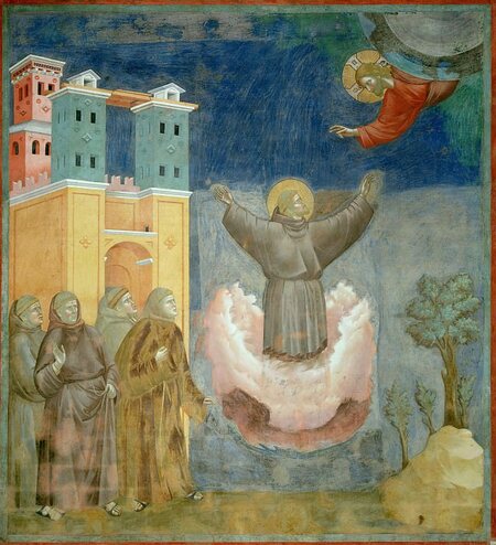 Сцены из жизни святого Франциска: 12 Экстаз Святого Франциск — «…несколько дней спустя они вернулись в дом того человека, и он стал из любопытства смотреть, что делает Франциск среди ночи; и он увидел его в молитве, а затем увидел, как святой в экстазе поднялся над землей, и был окружён ослепительным светом. И почувствовал тот человек нестерпимый небесный жар, который пробудил в нём желание подражать образу жизни малых братьев.»
