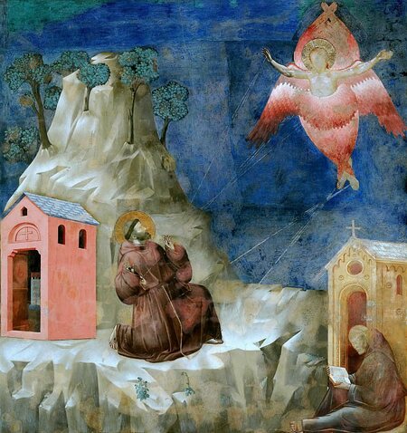 Сцены из жизни святого Франциска: 19 Стигматизация Святого Франциска — «…летом следующего года Франциск отправился на гору Верна — провести там пост в честь св. Михаила Архангела. (…) Франциск хотел кровью запечатлеть свою любовь. Он не мог пострадать от руки людей, теперь он беспрестанно молил о том Бога. Внезапно сверхъестественный свет разлился в небе, освещённом зарей, и в ярком зареве Франциск, охваченный экстатическим порывом, узрел Человека, распятого на Кресте. Два крыла серафима над головой, два крыла раскрыты, два крыла закрывают спину. Когда видение исчезло, из плоти его точилась кровь. Кровавые раны зияли на его руках и ногах, как будто он претерпел казнь через распятие. На ладонях и ступнях виднелись затвердения, похожие с одной стороны на головки гвоздей, с другой — на их заострённые и искривлённые концы. На ребре виднелась широкая рана с красными краями, откуда струилась по телу кровь, марая одежду.»