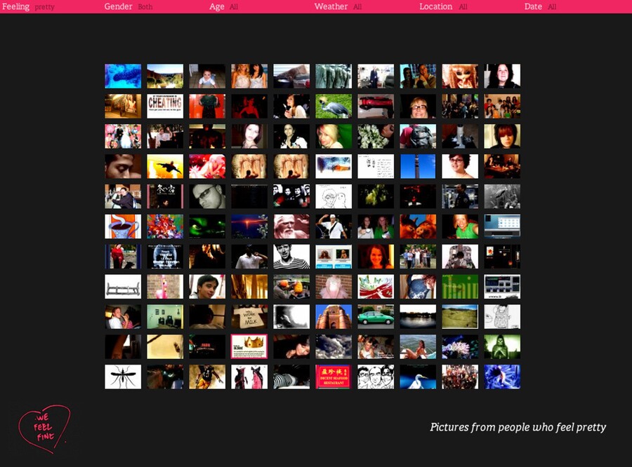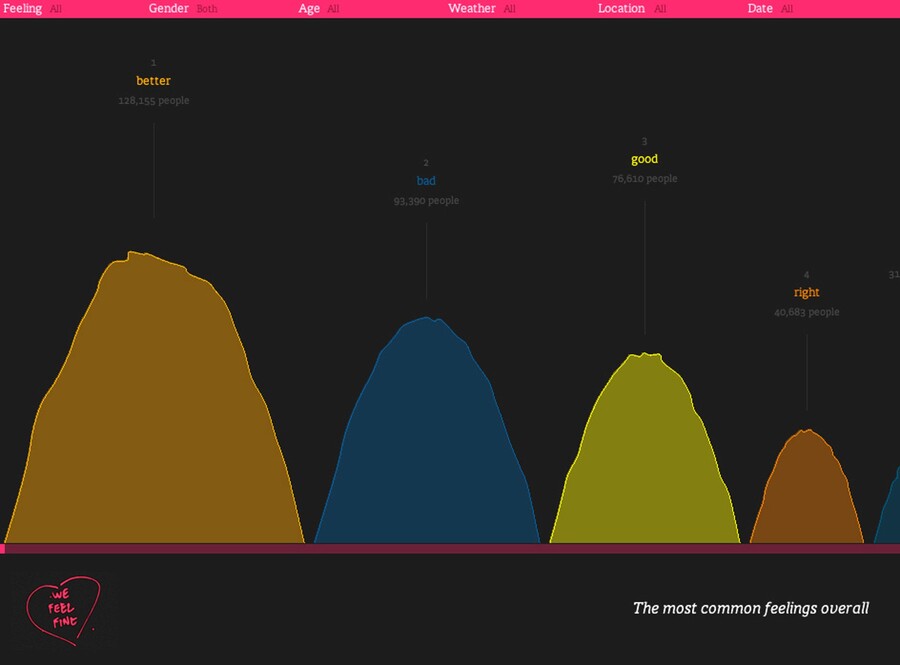 Проект «We Feel Fine» (в формате сайта и книги) Джонатана Харриса собирает и визуализирует человеческие чувства из блогов. Система ищет фразы «Я чувствую» и «Я чувствую себя» в блогах по всему миру, записывает предложение и определяет выраженное чувство (например, радость, грусть). Также собирается информация об авторе (возраст, пол, местоположение) и погоде. В результате получается база данных с миллионами чувств, которая постоянно растет. Эти чувства можно искать и сортировать по разным критериям: географии, полу, возрасту, погоде, чтобы ответить на вопросы о том, как разные люди чувствуют себя в разных ситуациях. Информация представлена в виде частиц, каждая из которых — одно чувство одного человека. Эти частицы можно упорядочивать разными способами, чтобы увидеть «полотна» человеческих эмоций.