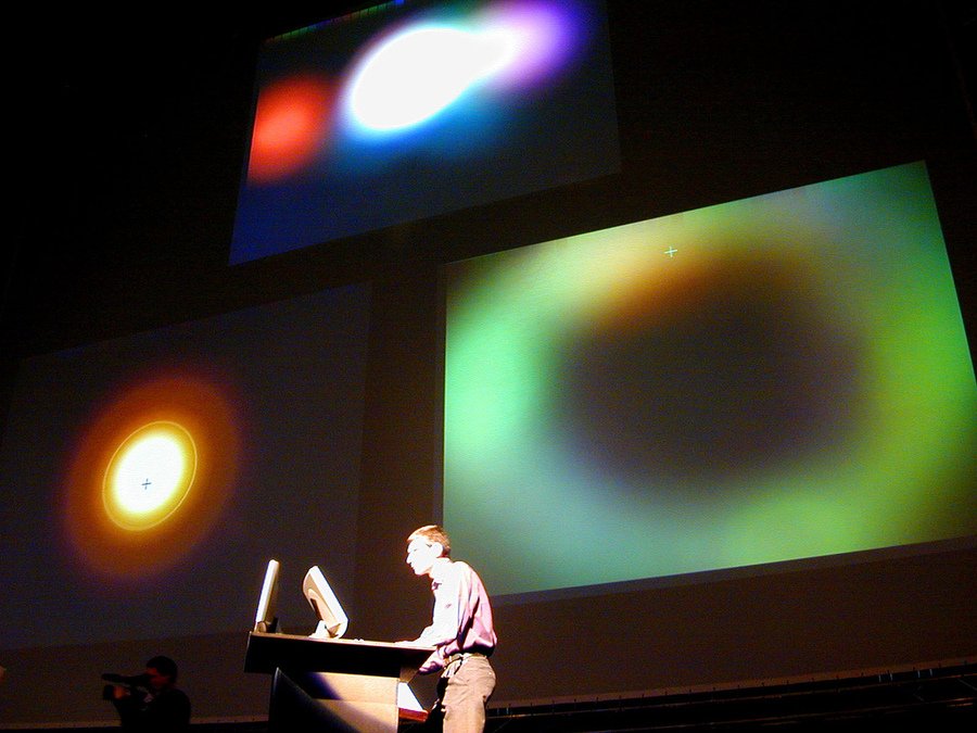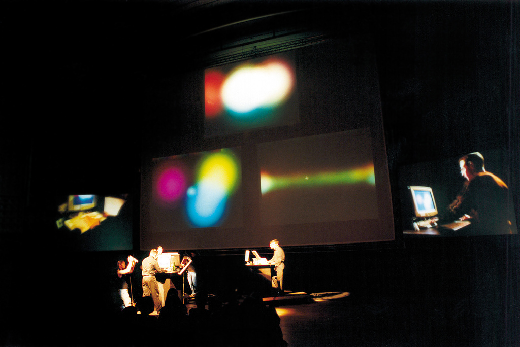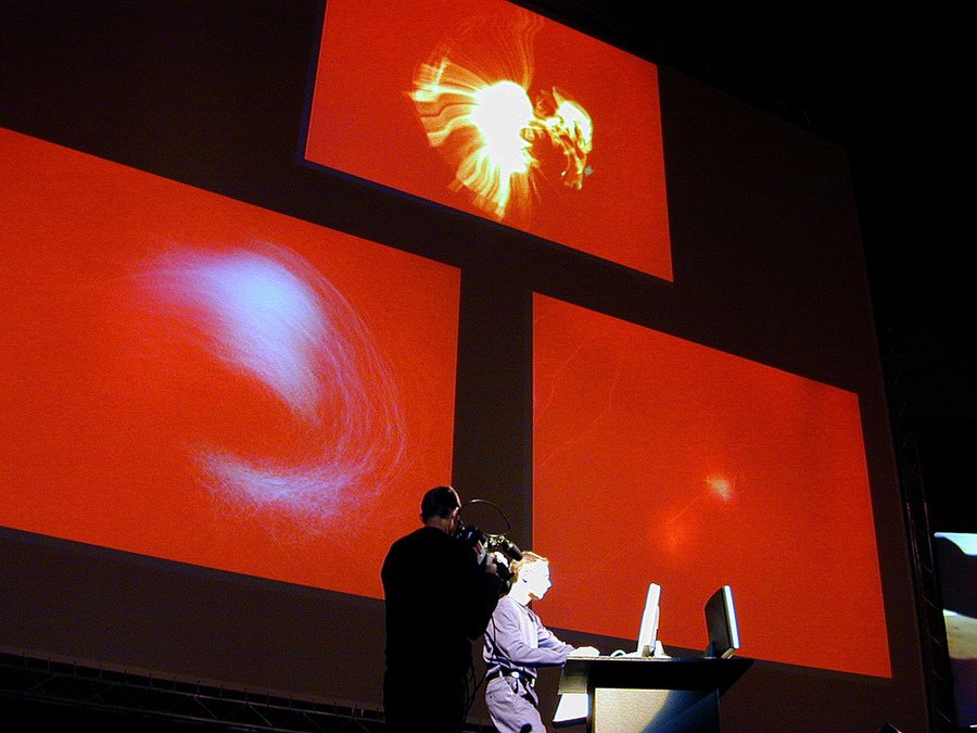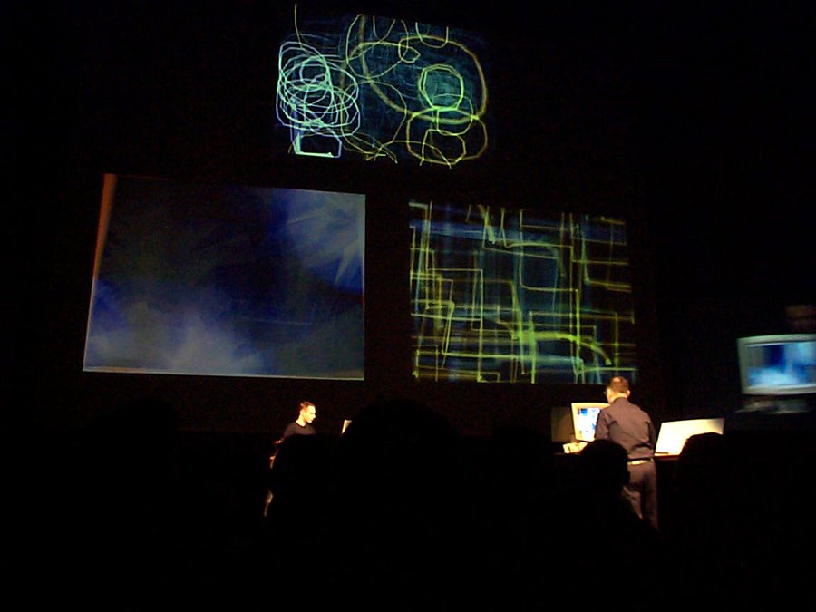 Перформанс «Scribble» Голана Левина, Грегори Шакара и Скотта Гиббонса — это исследование коллективного творчества через призму интерактивных технологий. Работа, созданная для фестиваля Ars Electronica, возрождает традиции кинетического светового искусства, но переосмысляет их в цифровой эпохе. С помощью Audiovisual Environment Suite (AVES) — набора из семи интерактивных систем — исполнители в реальном времени генерируют абстрактную анимацию и звук, превращая сцену в пространство коллективной импровизации.