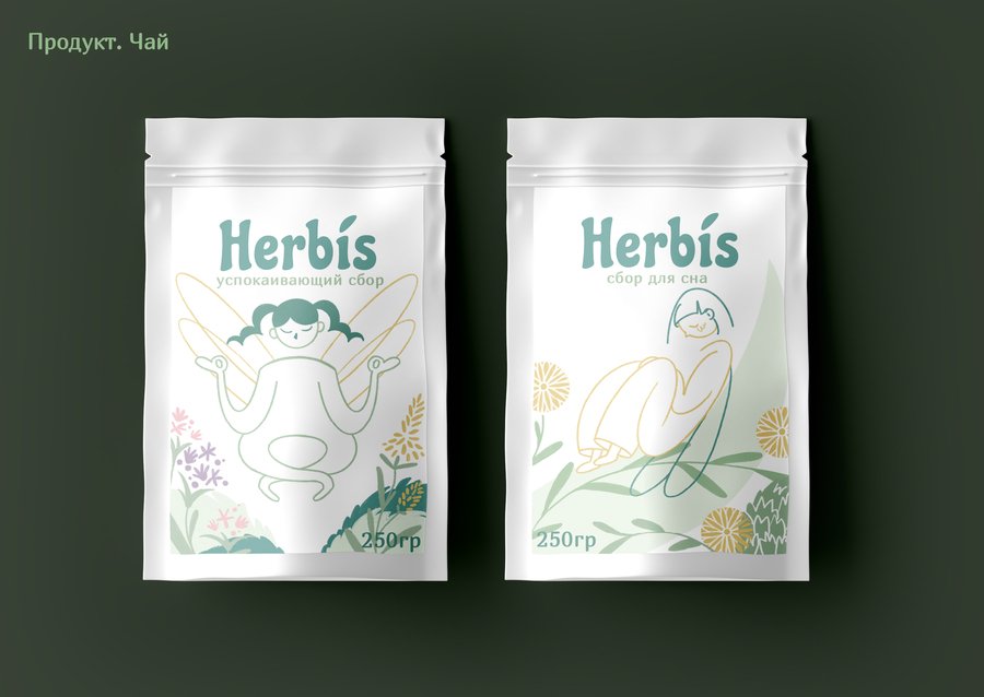 Prompt 2 for tea: create packaging for tea of the Herbis brand; the white paper packaging should have a minimalistic illustration of little minimalistic fairies with herbs, with herbs and berries in the background