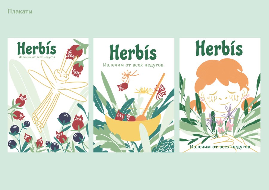 Готовые варианты плакатов-реклам были созданы с помощью промпта: generate a minimalistic poster with modern typography for the herbis brand selling vitamins based on berries and medicinal herbs. the poster should depict the brand name, a tagline «Healing from the Heart of the Forest», a package of tablets with the brand name and a minimalist illustration of fairies picking berries and flowers