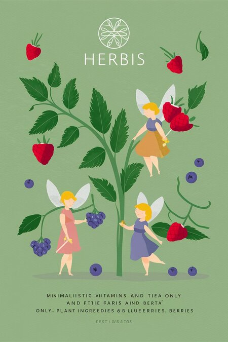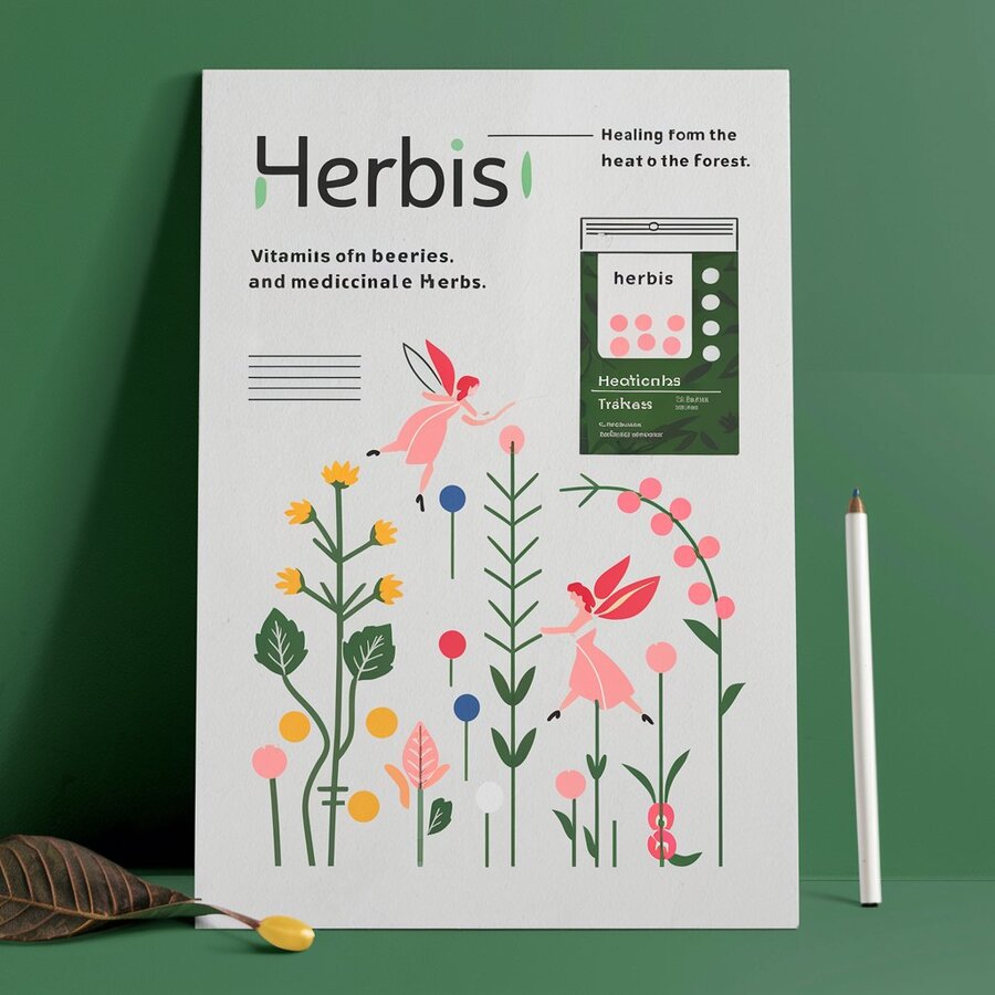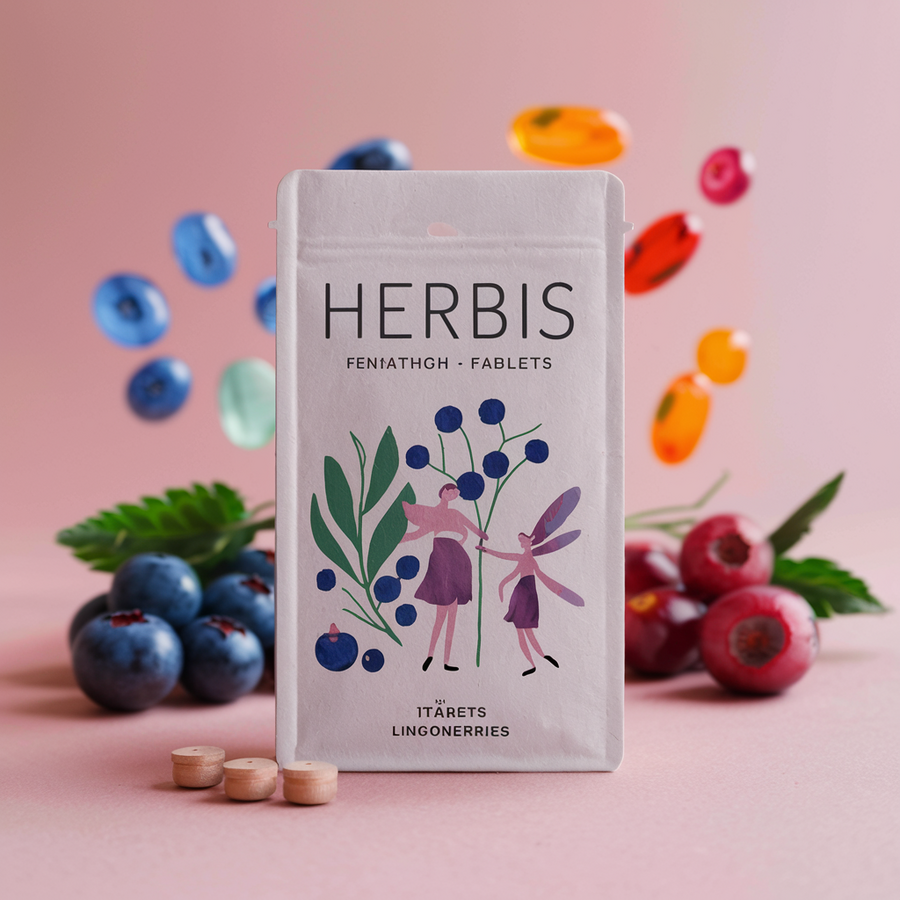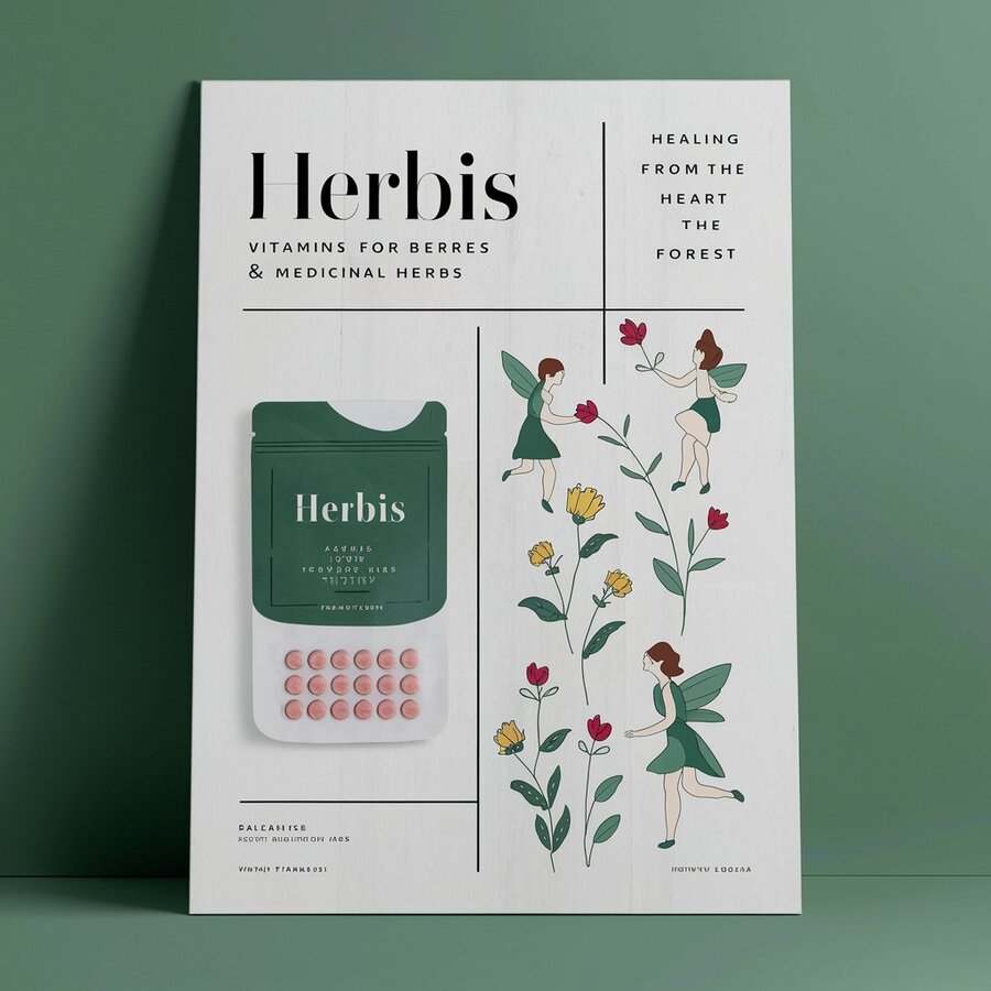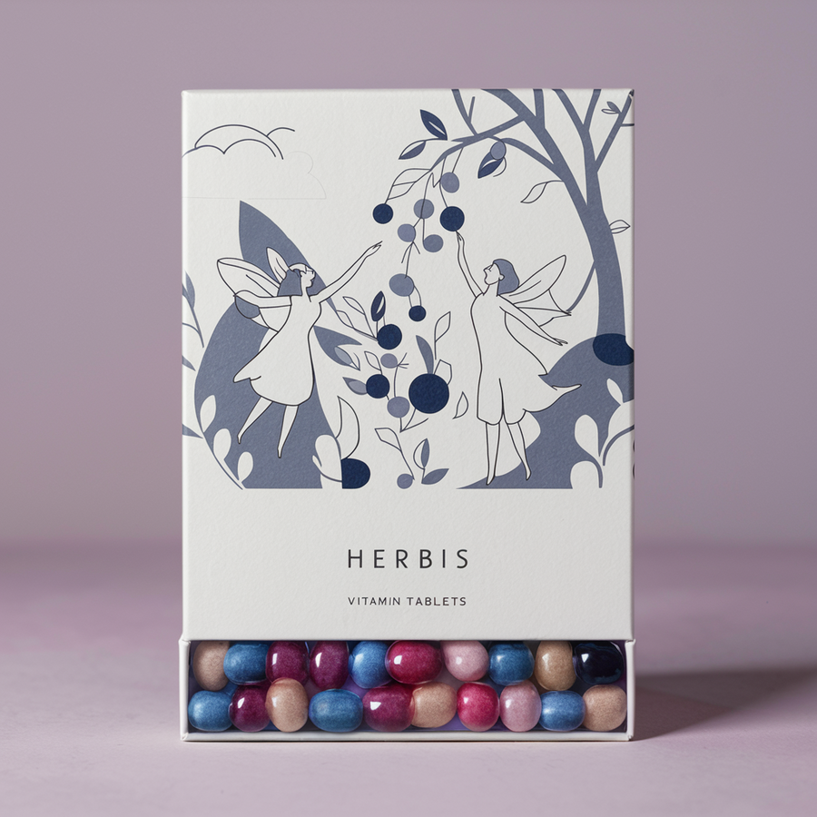Prompt: generate packaging for tablets of a brand called Herbis, with a minimalist illustration of berries and fairies, made with modern typography