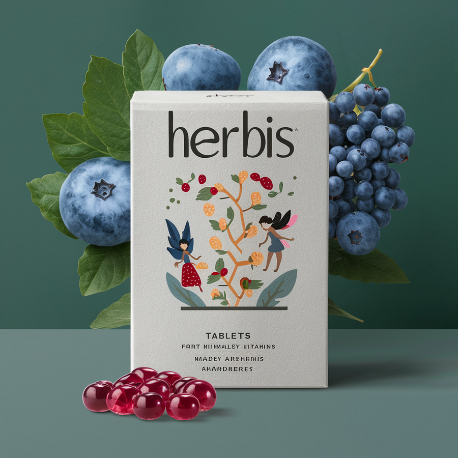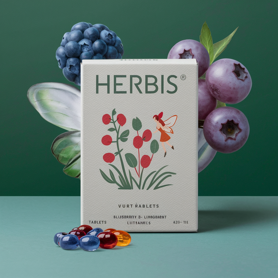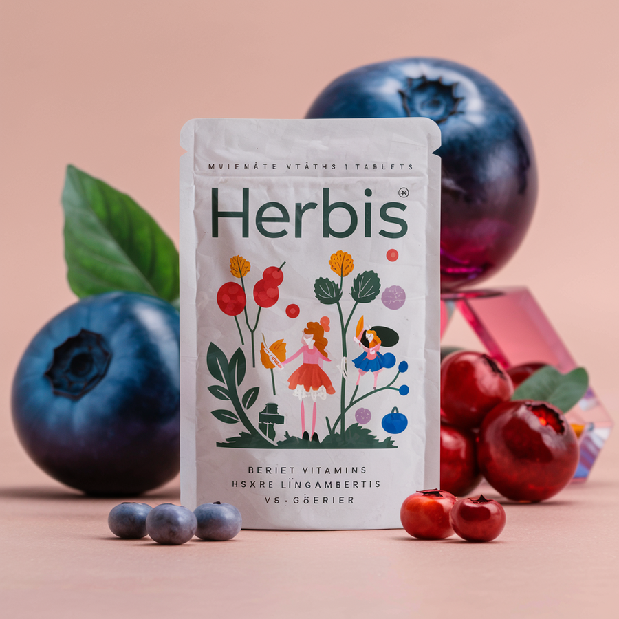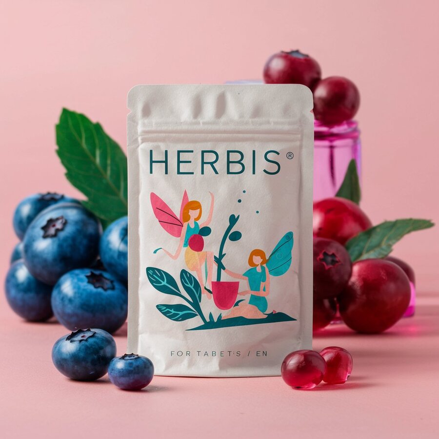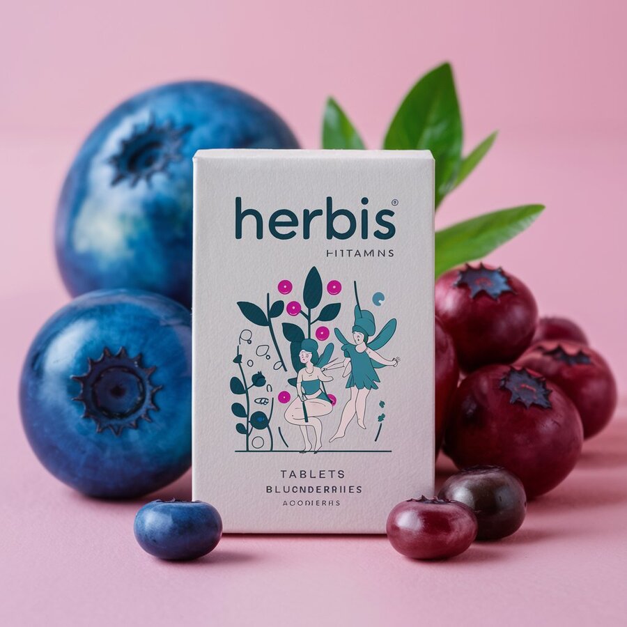 Prompt 1 for tablets: generate packaging for tablets of a brand called Herbis, with a minimalist illustration of berries and fairies, made with modern typography, on the background in front of the box at the bottom there should be translucent very small multi-colored vitamins in the form of blueberries and lingonberries