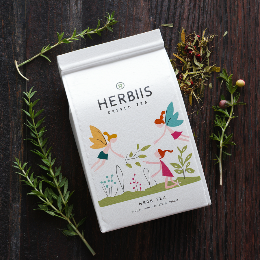 Prompt: create packaging for tea of the Herbis brand; the packaging should have a minimalistic illustration of little fairies collecting herbs and berries