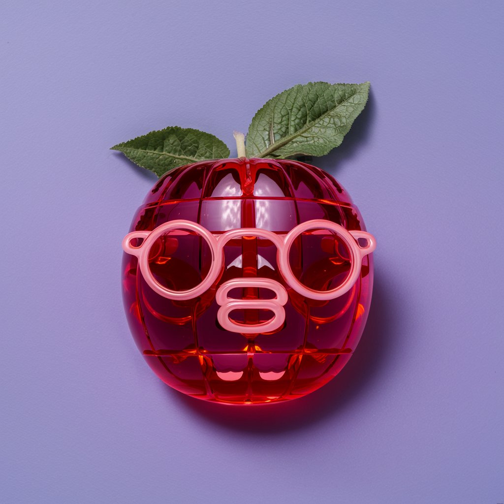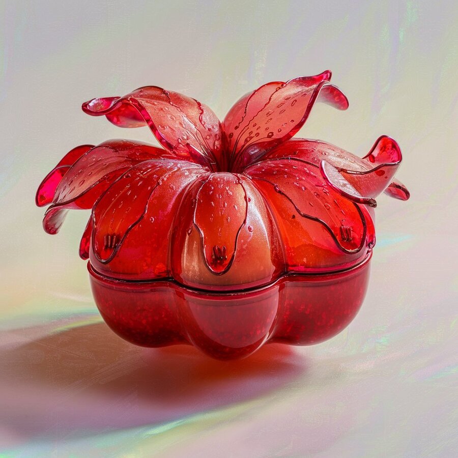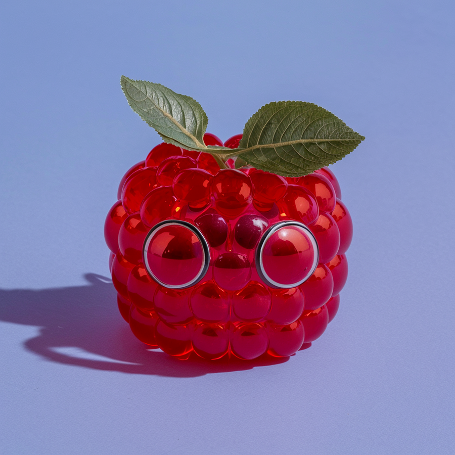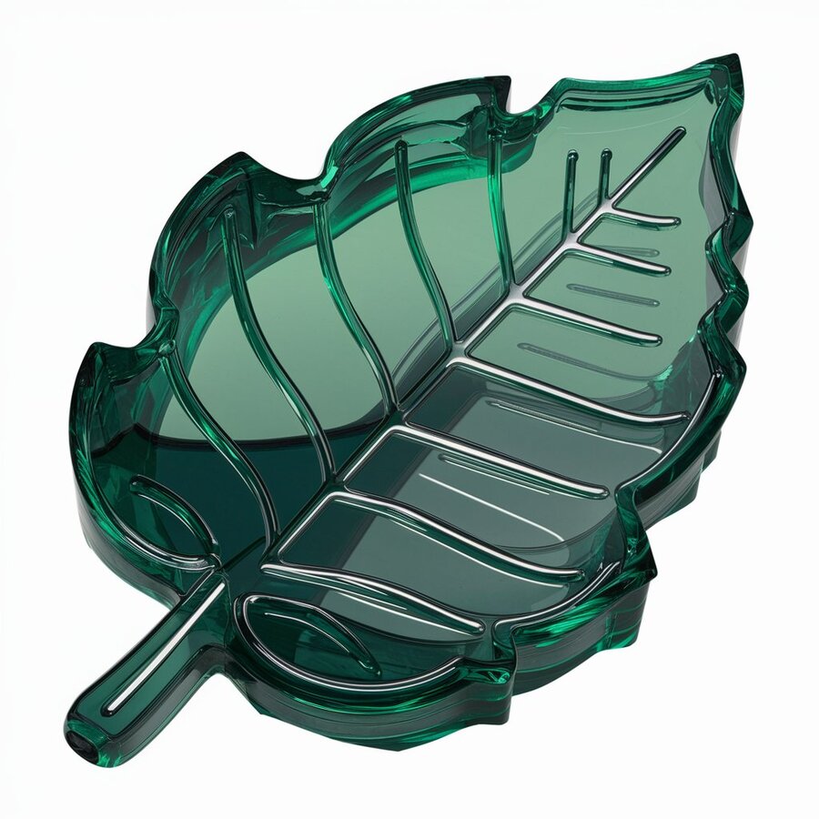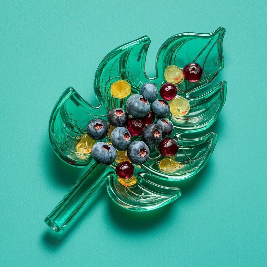 Prompt: generate translucent green pill box in the shape of leaf with translucent very small multi-colored vitamins in the form of blueberries and lingonberries