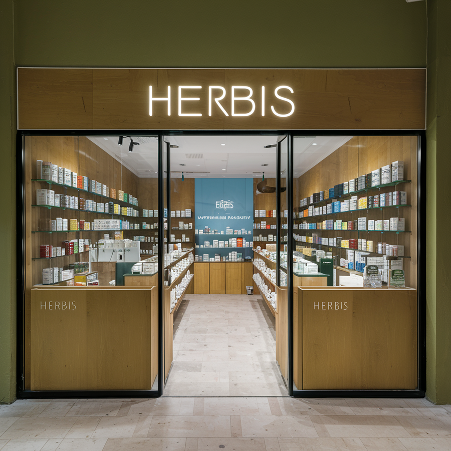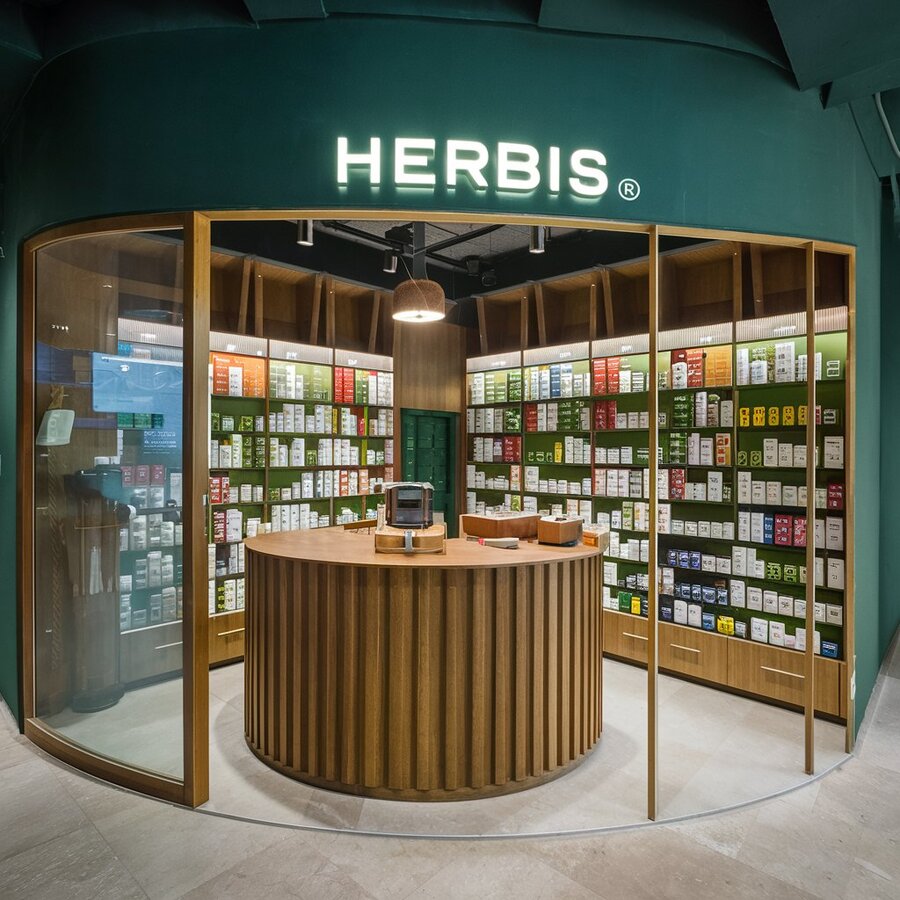 Prompt: a quaint, rustic pharmacy filled with the herbis brand, which makes vitamins and tea based on berries and medicinal herbs, the brand logo is prominently displayed, reflecting the nature