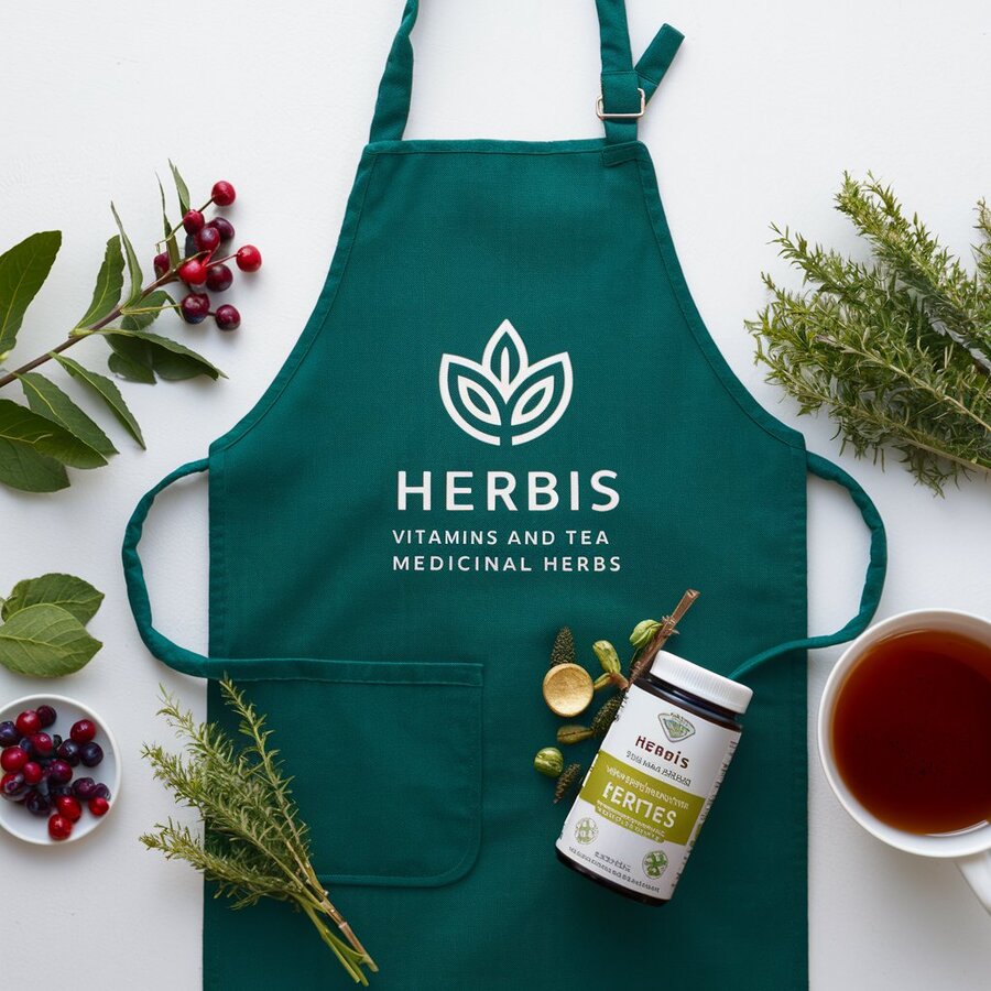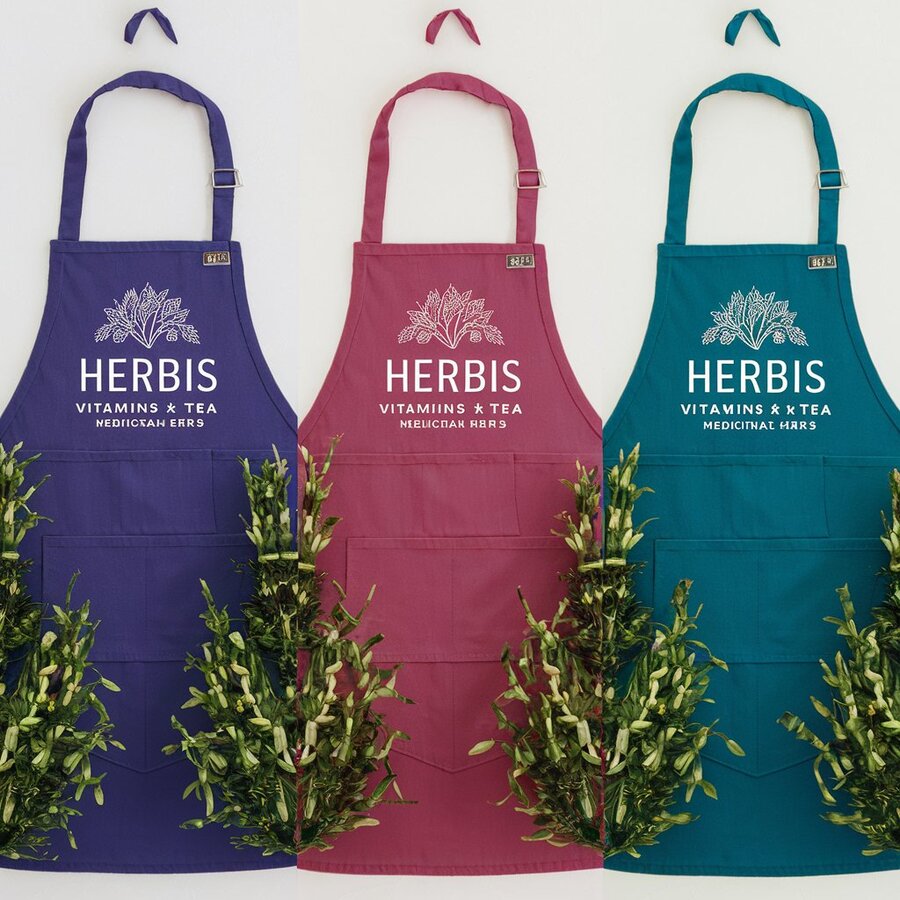 Prompt: generate work aprons for salespeople at a pharmacy that sells the herbis brand, which makes vitamins and tea based on berries and medicinal herbs