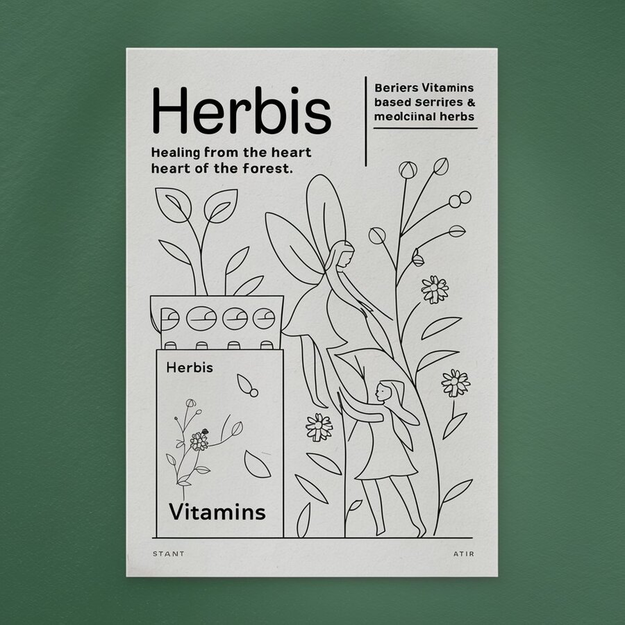 Prompt: generate packaging for tablets of a brand called Herbis, with a minimalist illustration of berries and fairies, made with colorless lines and modern typography