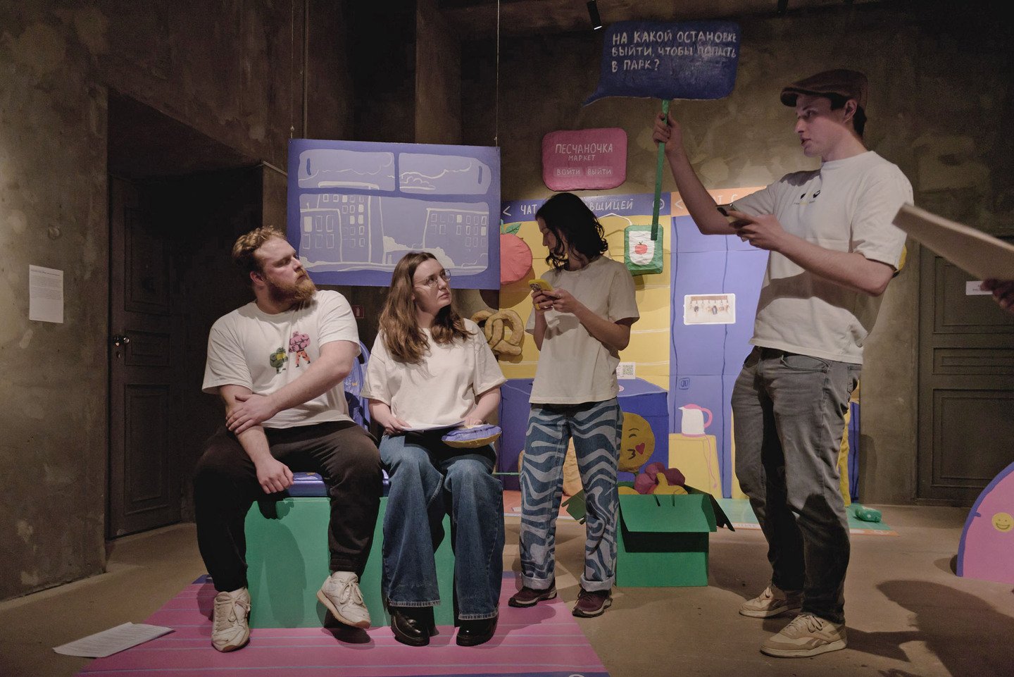Инсталляция включает в себя четыре сцены, действие которых разворачивается в привычных для всех местах: лифт, вход в торговый центр, супермаркет и общественный транспорт. Каждая ситуация выстроена как «чат» с персонажами, связанными с этим пространством. Все сцены объединяет общий нарратив, который раскрывается через перформанс и связывает их в единую историю.