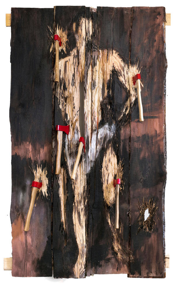 Нестор Энгельке Деревянный Святой Себастьян № 1 из серии «Деревянные св. Себастьяны», 2021 дерево, эмаль, деревопись 205×118×30 см