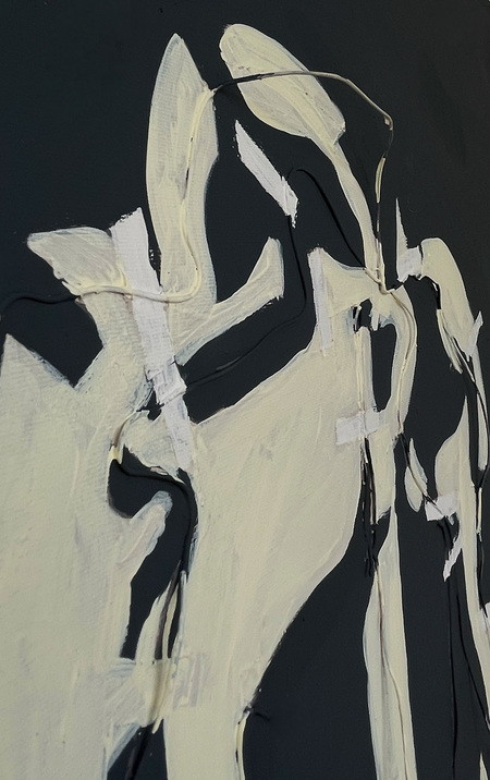 в своих работах я сравниваю пластику человеческого тела с пластикой изогнутой металлической проволоки. проволока закрепляется на холсте при помощи скотча, обозначая путь каждого дальнейшего изгиба. обводя проволоку несколько раз, я воссоздаю абстрактные формы, которые считываются как человеческие фигуры благодаря сохраняющимся границам.