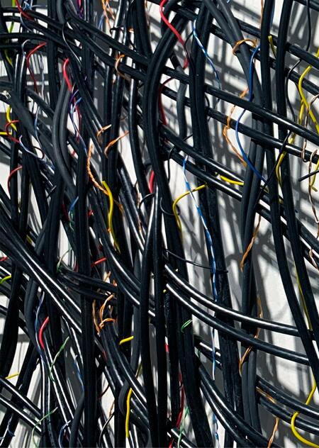 Полотно является моделью интернета: переплетения технологичных процессов и обилия электронных данных. Все это невидимо и непонятно, но используемо людьми каждый день. В работе совмещены технологии нашего времени и что-то, создающее уют в доме (полотно, ковер). Так, я пытаюсь «очеловечить» цифровой носитель, объединить «традиционное», ручное и теплое с холодом проводов.