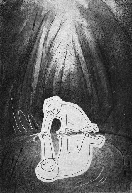 Гуляя по утреннему лесу, собирая шишки, ветки и ягоды, девочка замечает мальчика, сидящего на берегу озера.
