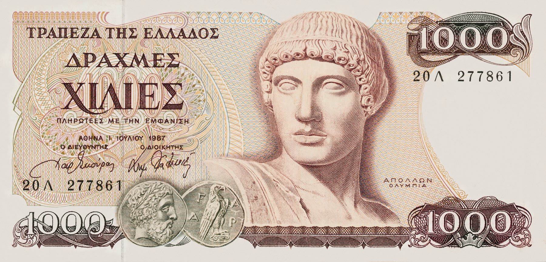 Купюра в 1000 драхм выпускалась Банком Греции с 1984 года. Перестала быть законным платёжным средством с 1 января 2002 года в связи с переходом на евро. На лицевой стороне размещено изображение бюста бога Аполлона Олимпийца, а также аверс и реверс древнегреческой серебряной монеты-тетрадрахмы, отчеканенной в Олимпии. На оборотной стороне находятся изображение знаменитой статуи дискобола работы скульптора Мирона и развалин храма богини Геры в Олимпии.