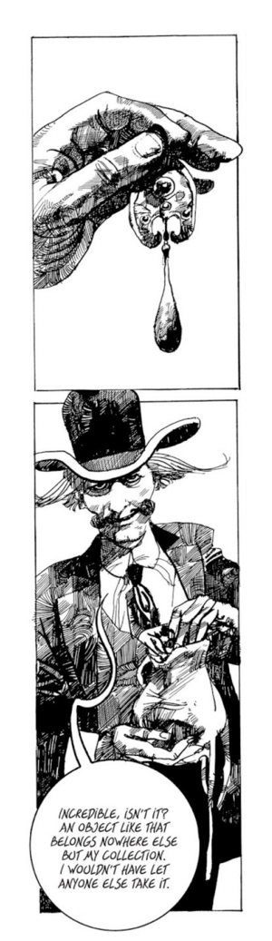 Такое поведение Коллекционера повторяется в его многочисленных поступках, вызывая у нас противоречивые чувства. Похожая динамика видна и в истории о Слезе Тамерлана. Коллекционер, стремясь сохранить видимость благородства, спасает бедного индейца от укуса скорпиона, выстрелив животному прямо в голову.