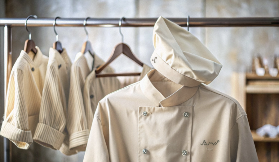 Product photo mockup: Promt: The chef’s suit jacket and cap are realistic