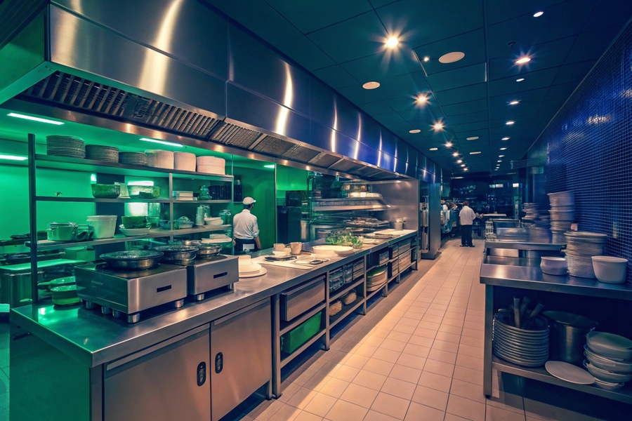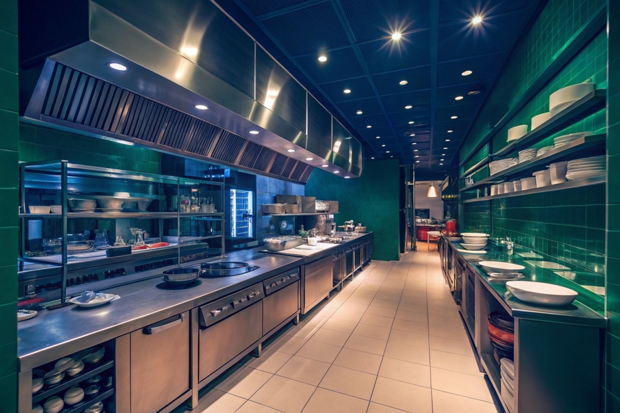 Promt: Modern professional kitchen in a high-end restaurant, designed for precision and efficiency. The space is spotless and well-organized, featuring stainless steel countertops, high-tech appliances, and open shelving with neatly arranged cookware. There are multiple workstations for chefs, each equipped with cutting-edge tools and ample space for food preparation. Bright, focused lighting illuminates the area, ensuring visibility for fine culinary work. The ambiance is a balance of functionality and sophistication, with subtle design elements like tiled walls and polished floors reflecting the restaurant’s commitment to excellence. Chefs in crisp uniforms are seen actively preparing gourmet dishes with skill and attention to details