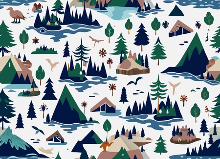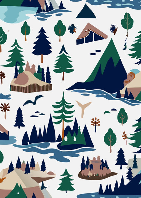 Pattern: Style: Seamless Vector/Model: Redraft 20B Colors: #011640 #012840 #115945 #A6796F Promt: The pattern for with lake forest boat motifs