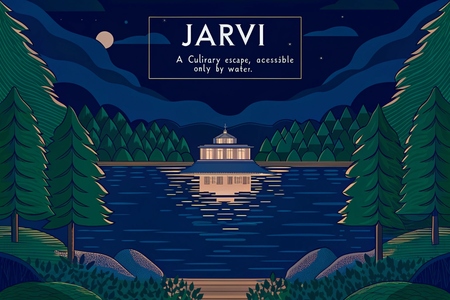 A poster for «Jarvi,» a fine dining restaurant located in a picturesque setting on a serene Karelian lake, far removed from civilization. The design features a stunning visual of a peaceful lake surrounded by lush green forests, with the restaurant’s elegant structure blending seamlessly into the natural landscape. The minimalist style of the poster uses calming shades of blue, green, and earthy browns, evoking a sense of exclusivity and tranquility. A tagline reads: «Jarvi — A culinary escape, accessible only by water